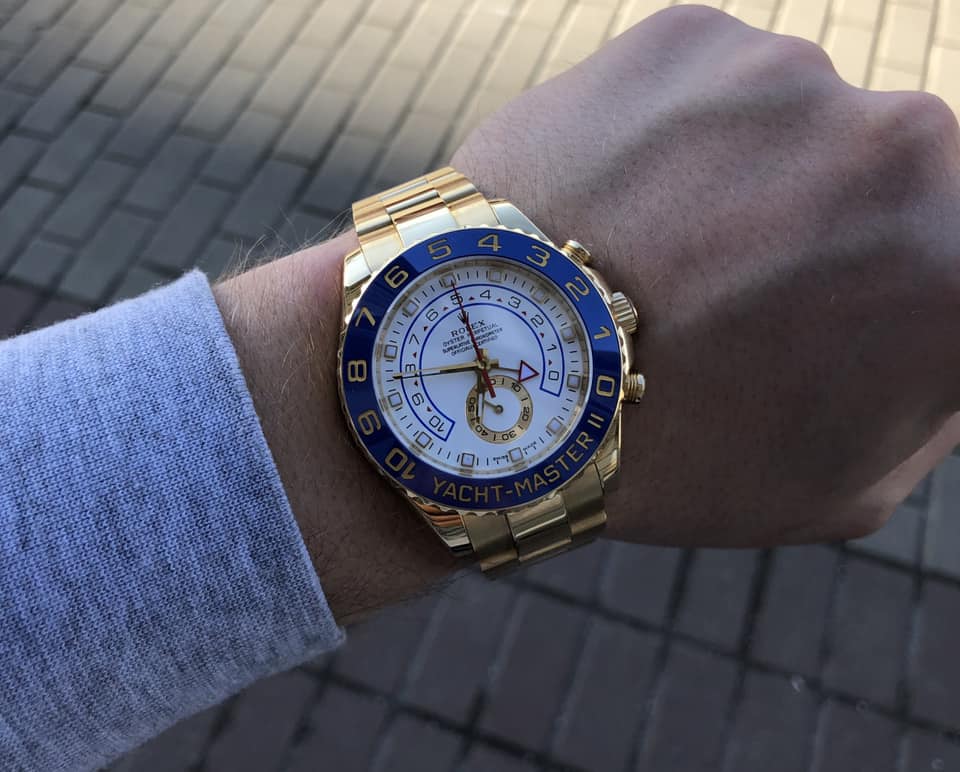 Đồng hồ Rolex nam Yacht - Master II được gọi là đồng hồ bấm giờ regatta. Lấy cảm hứng từ biển cả, chiếc đồng hồ này được thiết kế khung gốm màu xanh với các số mạ vàng.