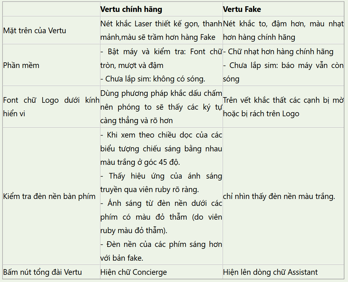 Sau đây là bảng so sánh giữa Vertu chính hãng và Vertu Fake để cho bạn dễ phân biệt và hình dung hơn.
