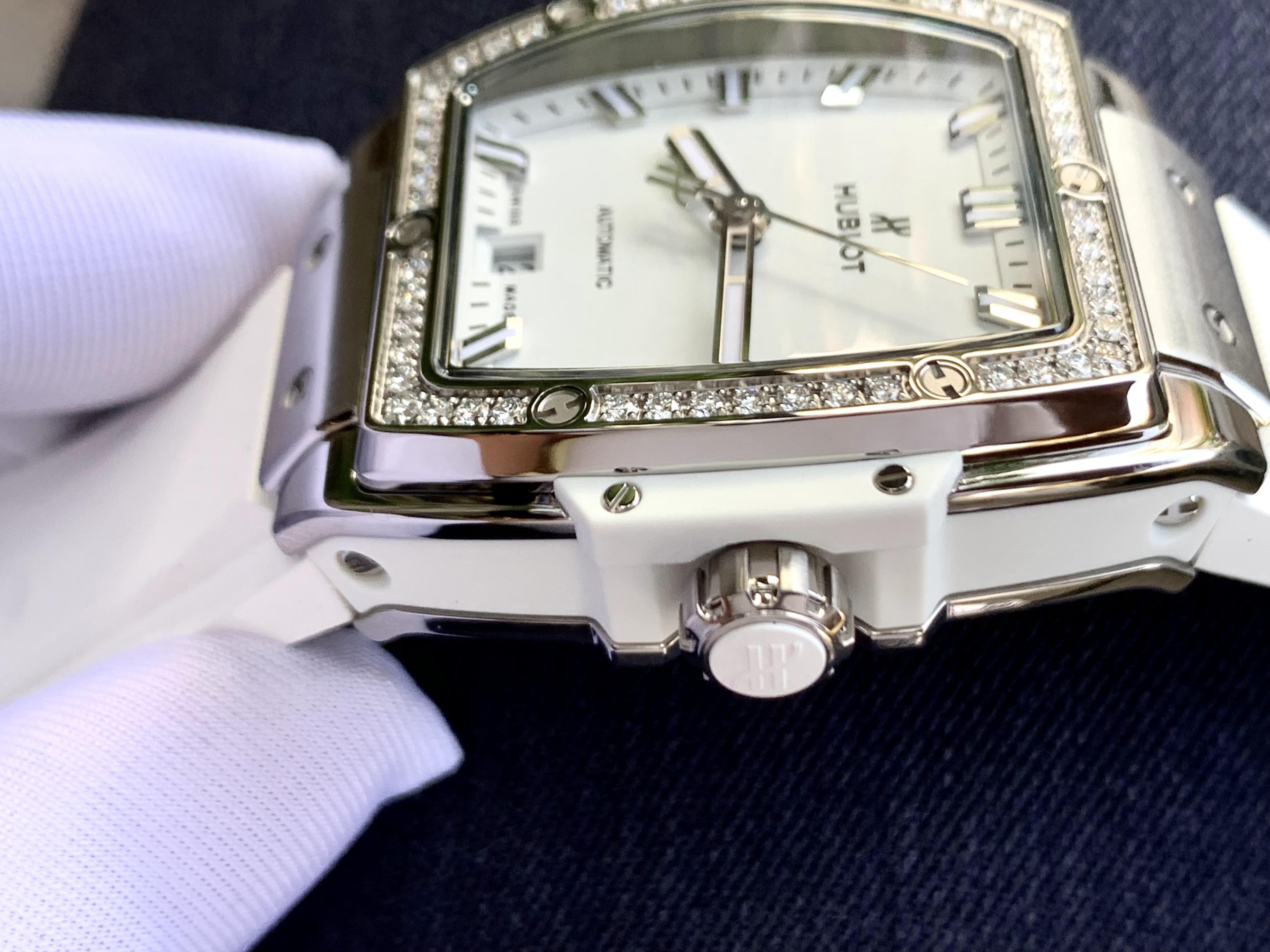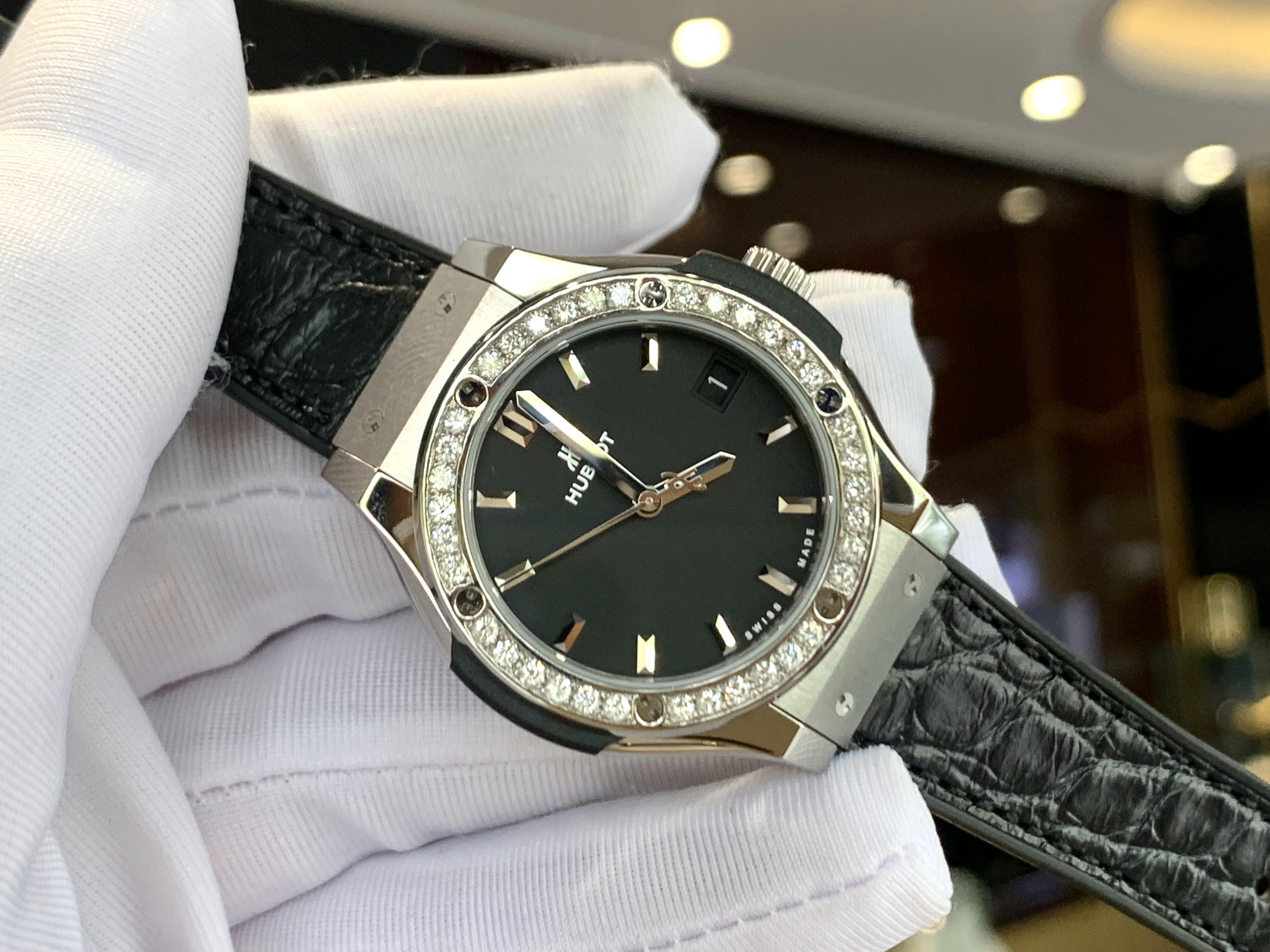 Đây là mẫu đồng hồ dành cho các quý cô với mức giá khá “dễ chịu” so với các sản phẩm khác nhà Hublot. Nó đang được bán với giá 135 triệu đồng tại EU Luxury. Mặt số đen huyền bí được bao quanh bởi phần vành đính kim cương tự nhiên làm nên sức quyến rũ cho chiếc đồng hồ này.