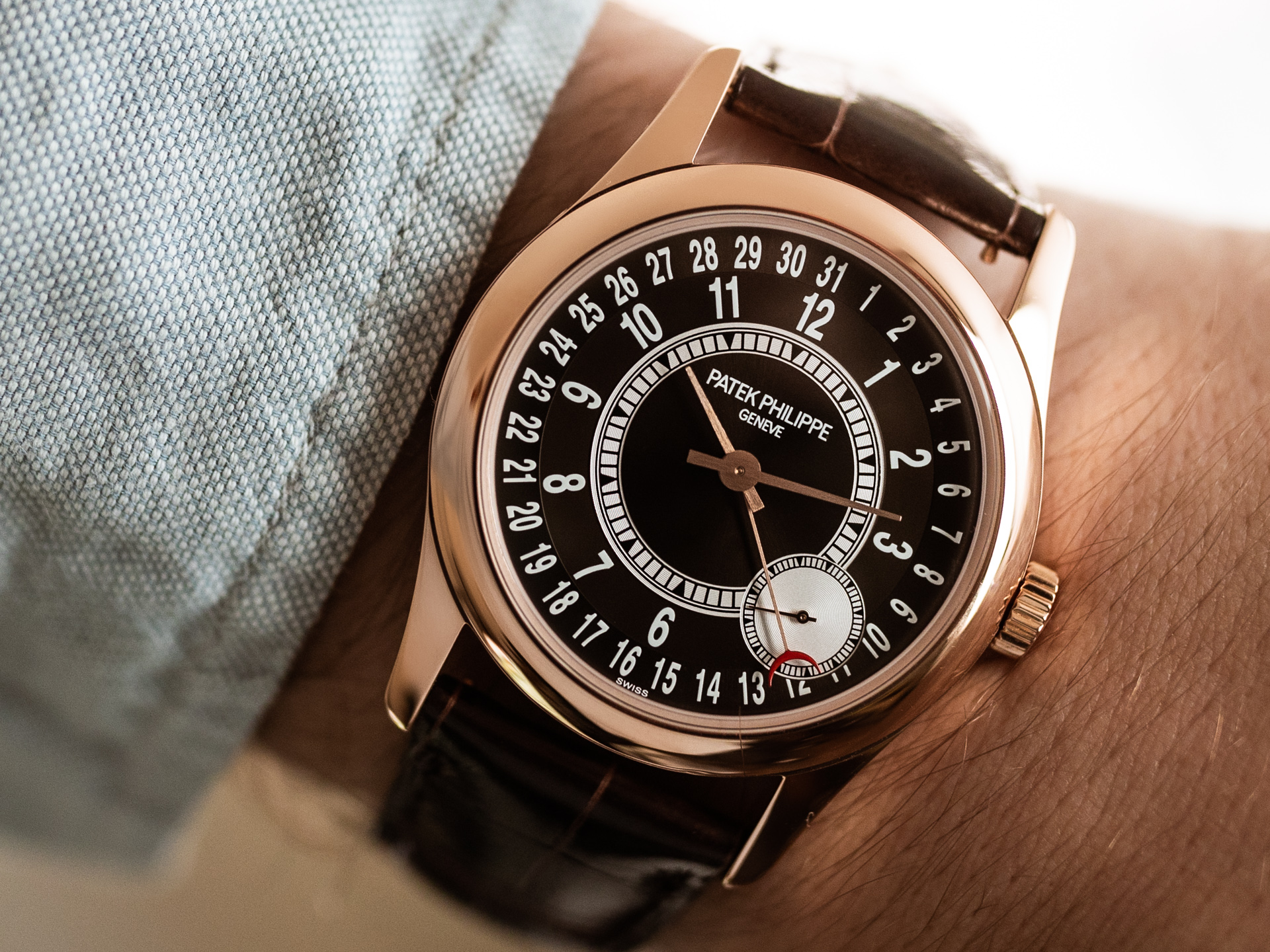 Các chi tiết bên trong chiếc đồng hồ Calatrava Rose Gold 6000R-001 mới là đắt giá hơn cả. Tông màu nâu bao phủ từ dây đeo vào đến trong mặt đồng hồ. Nổi bật trên đó là các chi tiết màu trắng cùng với bộ kim tông nâu nhạt. Đây là cách phối màu khá khó vì nếu không tinh tế nó sẽ làm người đeo bị già đi. Nhưng mọi thứ đã được Patek Philippe thể hiện một cách khéo léo và cầu kỳ. Đẳng cấp chế tạo không dễ gì có được.