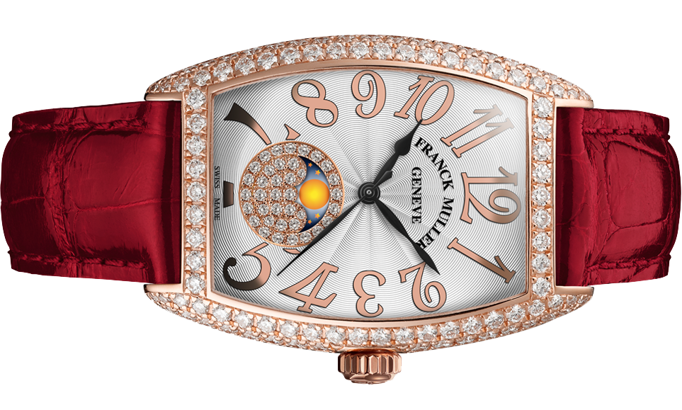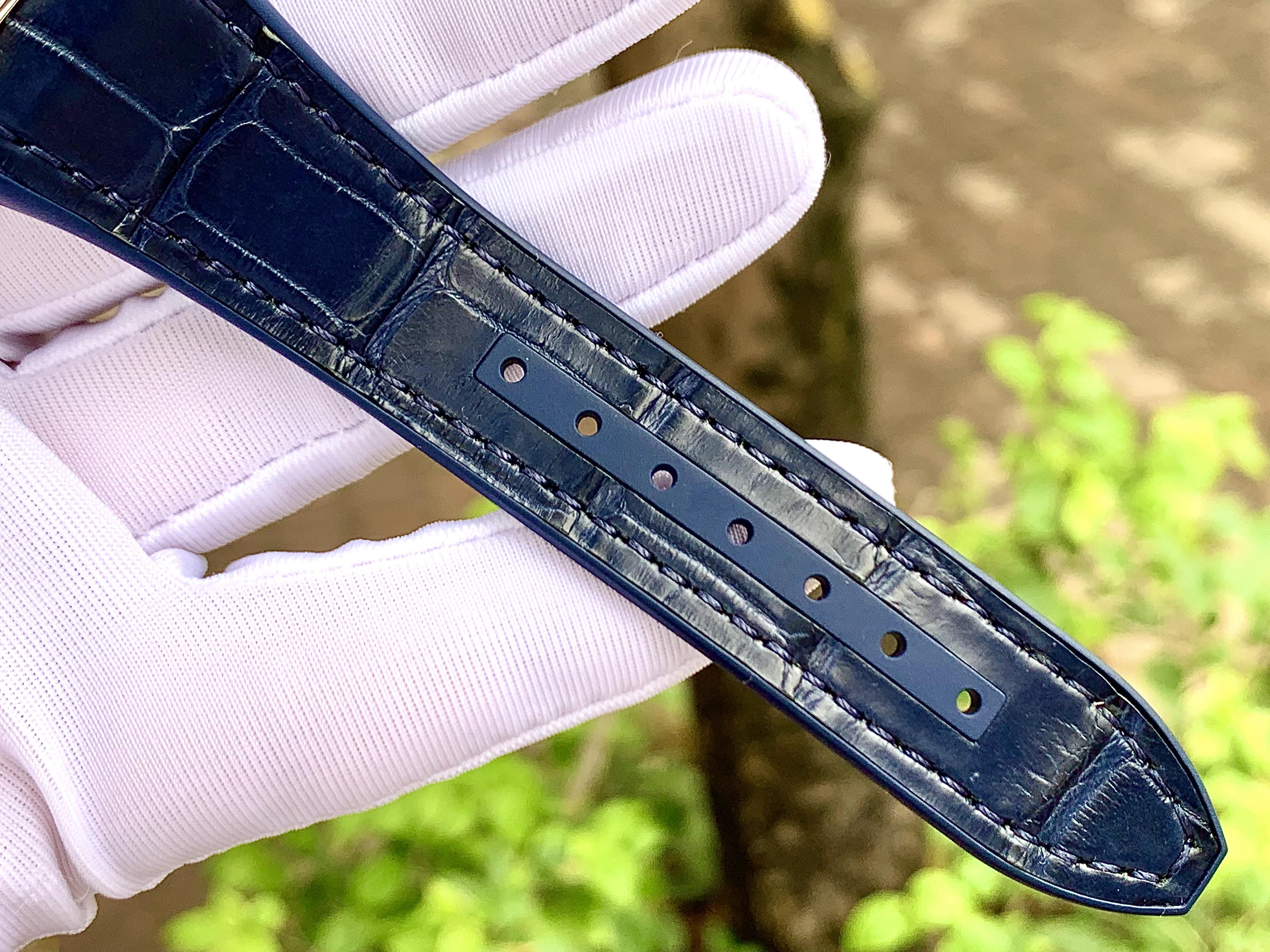 Sản phẩm giống như một món quà ngọt ngào mà lãng mạn mà Franck Muller dành cho các quý cô. Phần dây đeo vẫn làm từ da cá sấu nhưng được nhuộm màu đỏ nhung cực sang trọng. Nó cũng là minh chứng cho thấy khả năng linh động của dây da đối với các mẫu thiết kế. Bạn sẽ ấn tượng với sự cẩn thận trọng từng đường kim mũi chỉ của sản phẩm.
