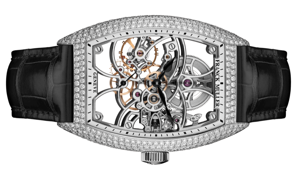 Đây là một trong những thiết kế lộ xương đẹp nhất trong lịch sử chế tác đồng hồ. Thông qua mặt kính sapphire trong suốt, người dùng có thể quan sát trọn vẹn các chi tiết máy đang vận hành như thế nào. Điều đó mang lại sức lay động vô cùng lớn với những trái tim yêu đồng hồ. Kết hợp với vành nạm kim cương và dây da cổ điển, Franck Muller Cintrée Curvex Skeleton 8880 xứng đáng với mức giá xa xỉ bậc nhất.