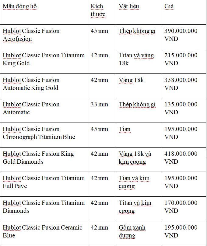 Hublot classic fusion là một dòng đồng hồ cao cấp, có giá từ vài chục triệu đến vài trăm triệu đồng, tùy thuộc vào phiên bản và vật liệu. Bạn có thể tham khảo bảng giá Hublot classic fusion tại đây.