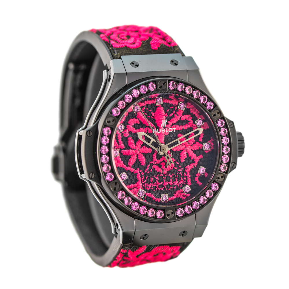 Điểm nhấn của sản phẩm đồng hồ Hublot nữ Fluo Hot Pink Limited Edition đó là được đánh bóng bằng gốm đen. Hơn nữa được đính thêm 36 viên Sapphire và cố định bằng 6 ốc Titanium hình chữ H đặc trưng.