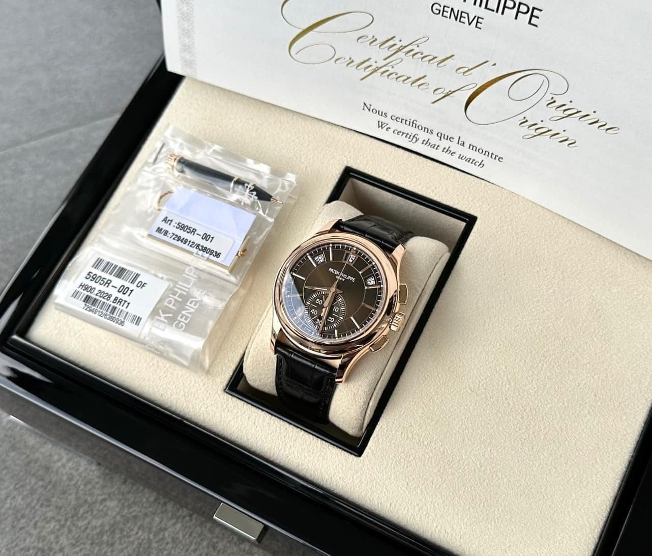 Với tông màu vàng đen sang trọng, chiếc đồng hồ cơ Patek Philippe Complications 5905R được rất nhiều khách hàng yêu thích.
