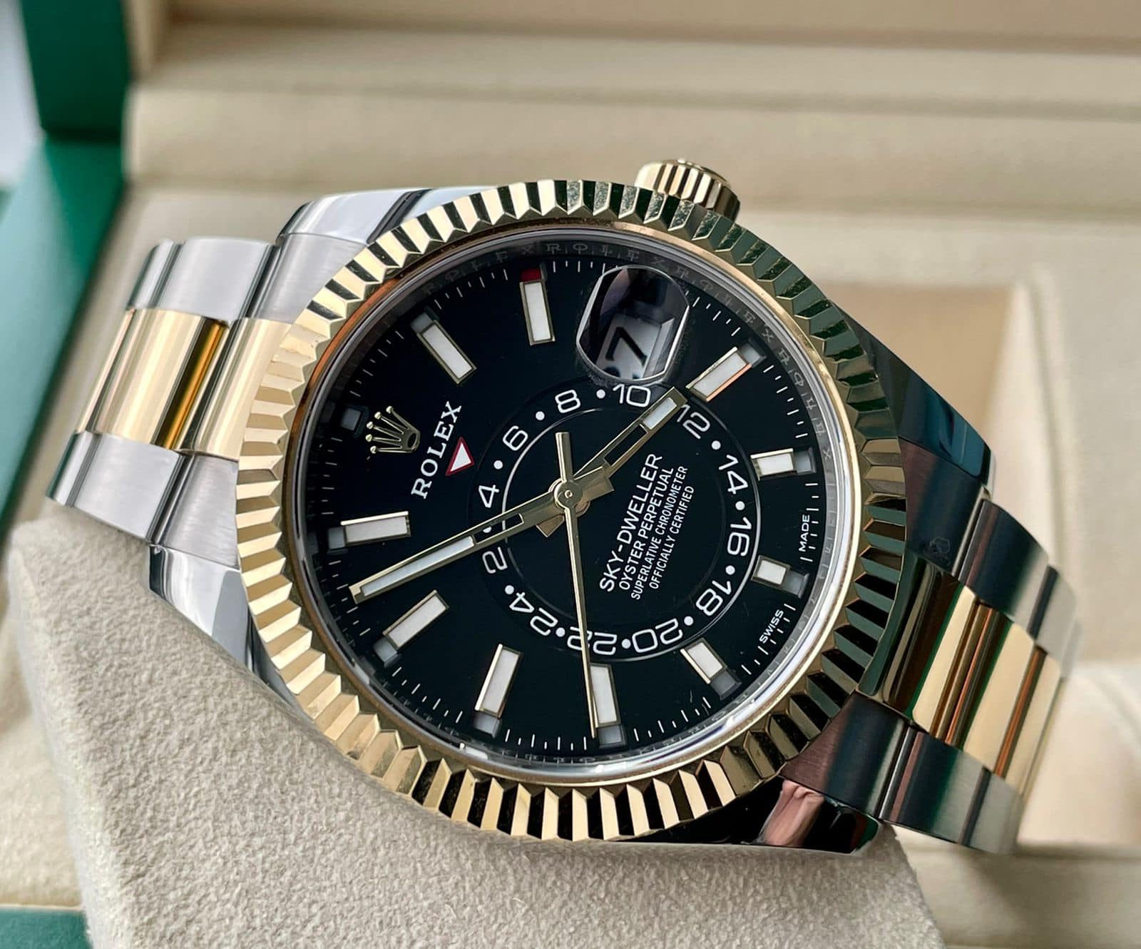 Được thiết kế dành riêng cho những quý ông lịch lãm, mẫu đồng hồ Rolex Sky Dweller sở hữu vẻ đẹp nam tính, đầy cuốn hút. Dây đeo Oyster với khóa Oysterclasp 3 mắt càng giúp sản phẩm trở nên nổi bật hơn.