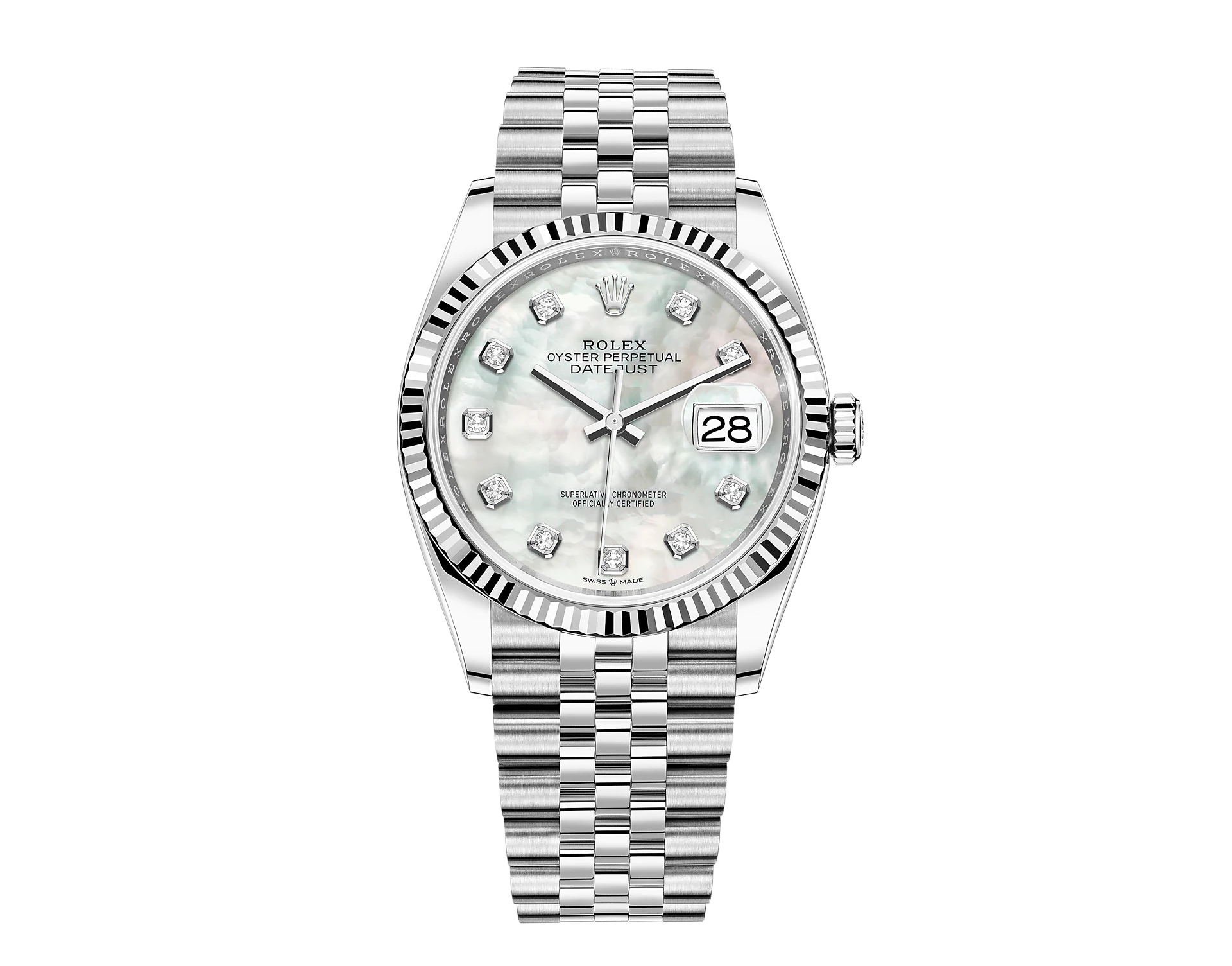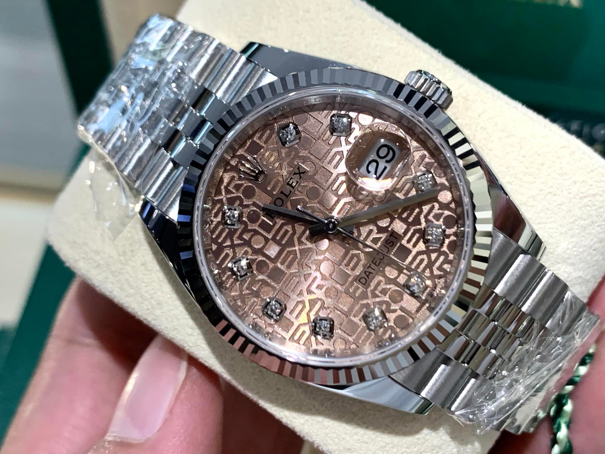 Rolex Datejust 36 khoác lên mình chiếc áo tinh khiết sang trọng kết hợp với bề mặt số bằng vỏ ngọc trai cao cấp. Chất liệu này khiến Rolex Datejust 36 dù là đồng hồ Rolex giá rẻ nhưng tỏa sáng hơn bao giờ hết. Ngoài ra vỏ ngọc trai còn tăng tính bền cho sản phẩm. Các cọc số bằng kim cương được nghệ nhân đồng hồ điêu khắc 1 cách vuông vức đến từng milimet. Tất cả làm nên Rolex Datejust 36 đẳng cấp thời thượng hơn bao giờ hết.