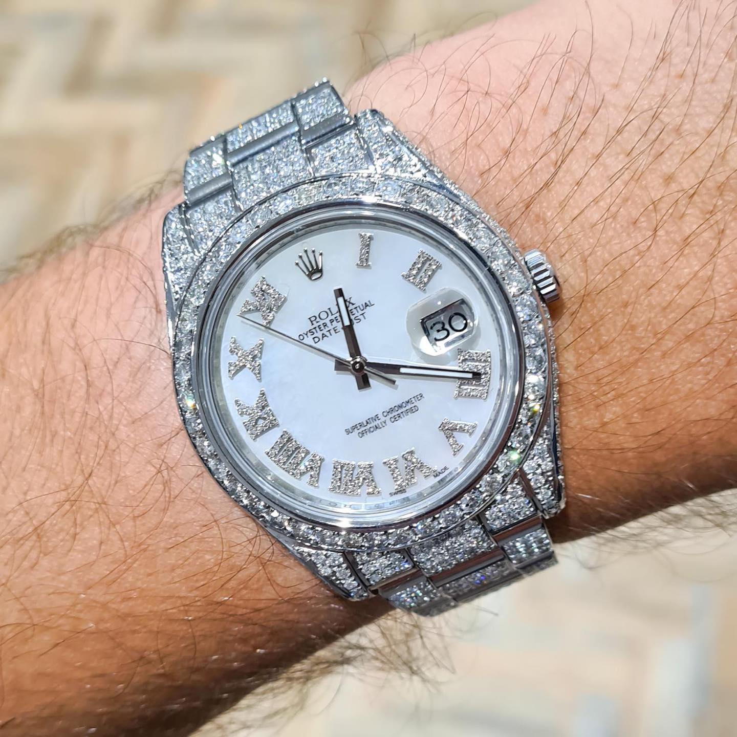 Tại phần vỏ đồng hồ được nạm 9,75 carat kim cương tạo nên vẻ sang trọng, đẳng cấp. Thêm vào đó vòng bezel được trang trí bởi 5,75 carat kim cương nhỏ lấp lánh, thật bắt mắt khi đeo trên cổ tay. Lớp phủ sapphire chống phản chiếu bảo vệ và mang đến trải nghiệm xem giờ cực kỳ đẹp mắt, xuyên thấu đến từng chi tiết nhỏ nhất bên trong.