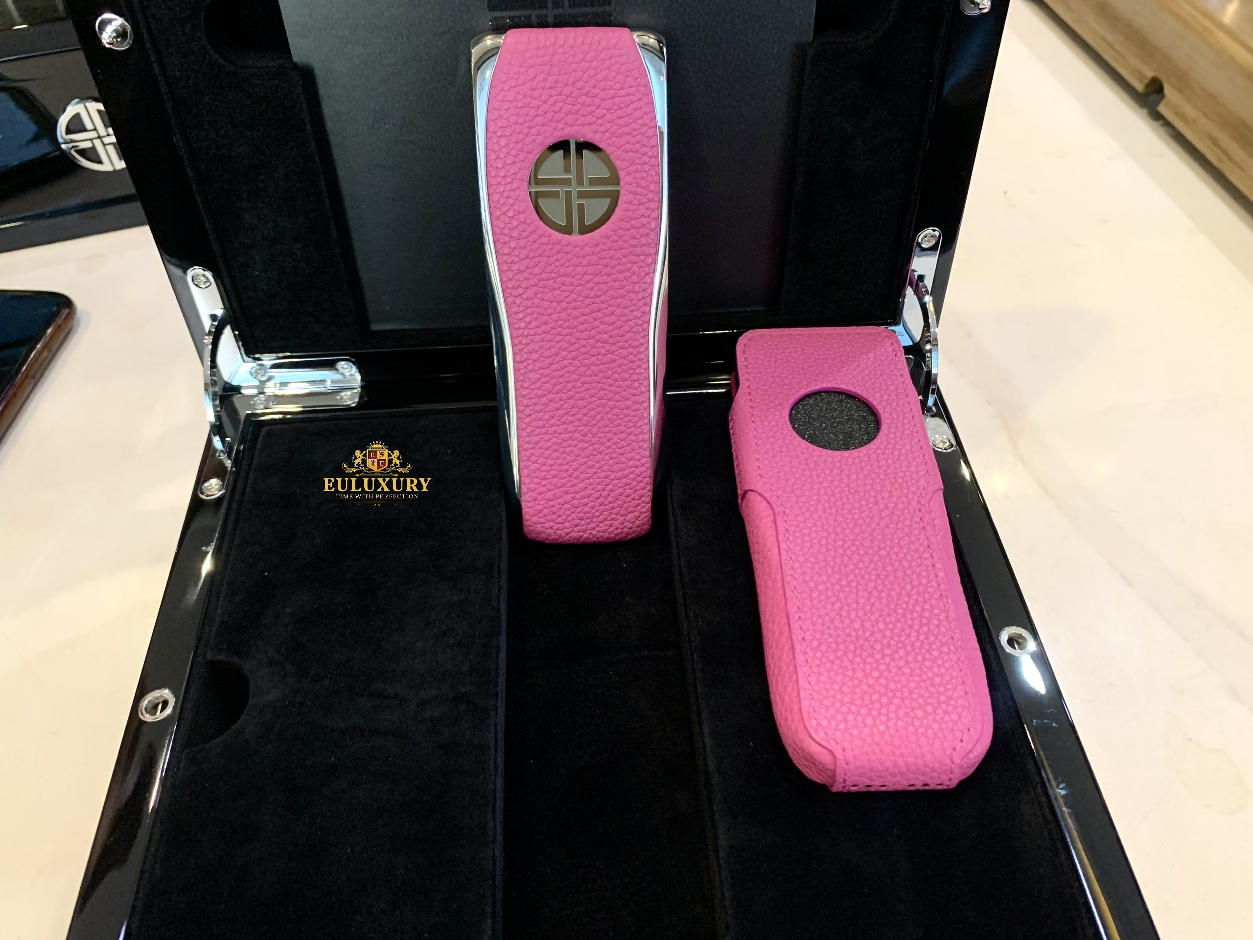 Sự đắt đỏ nhất của XOR Titanium Rose không thể không kể đến phần da nằm ở lưng của thiết bị. Tấm da bê Thụy Sĩ đẳng cấp được chế tác trực tiếp bởi Jean Russo – nhà thuộc da hàng đầu thế giới. Tấm da bê được nhuộm hồng nổi bật với logo XOR lớn đặt ở mặt lưng, thiết kế theo hình tượng một chiếc khiên bảo vệ.