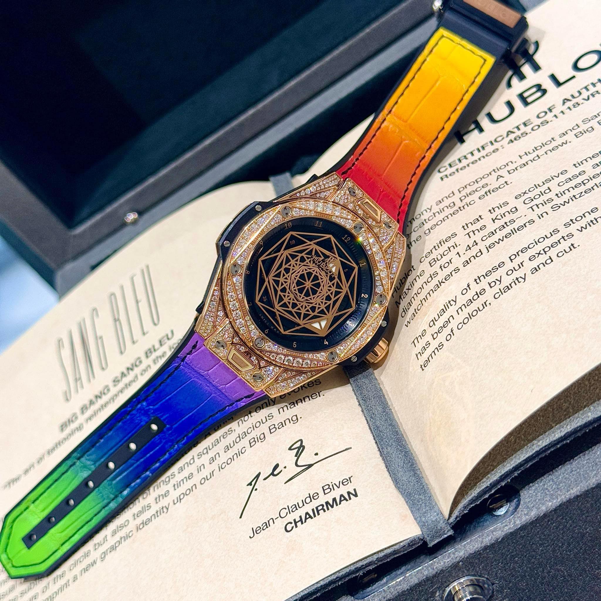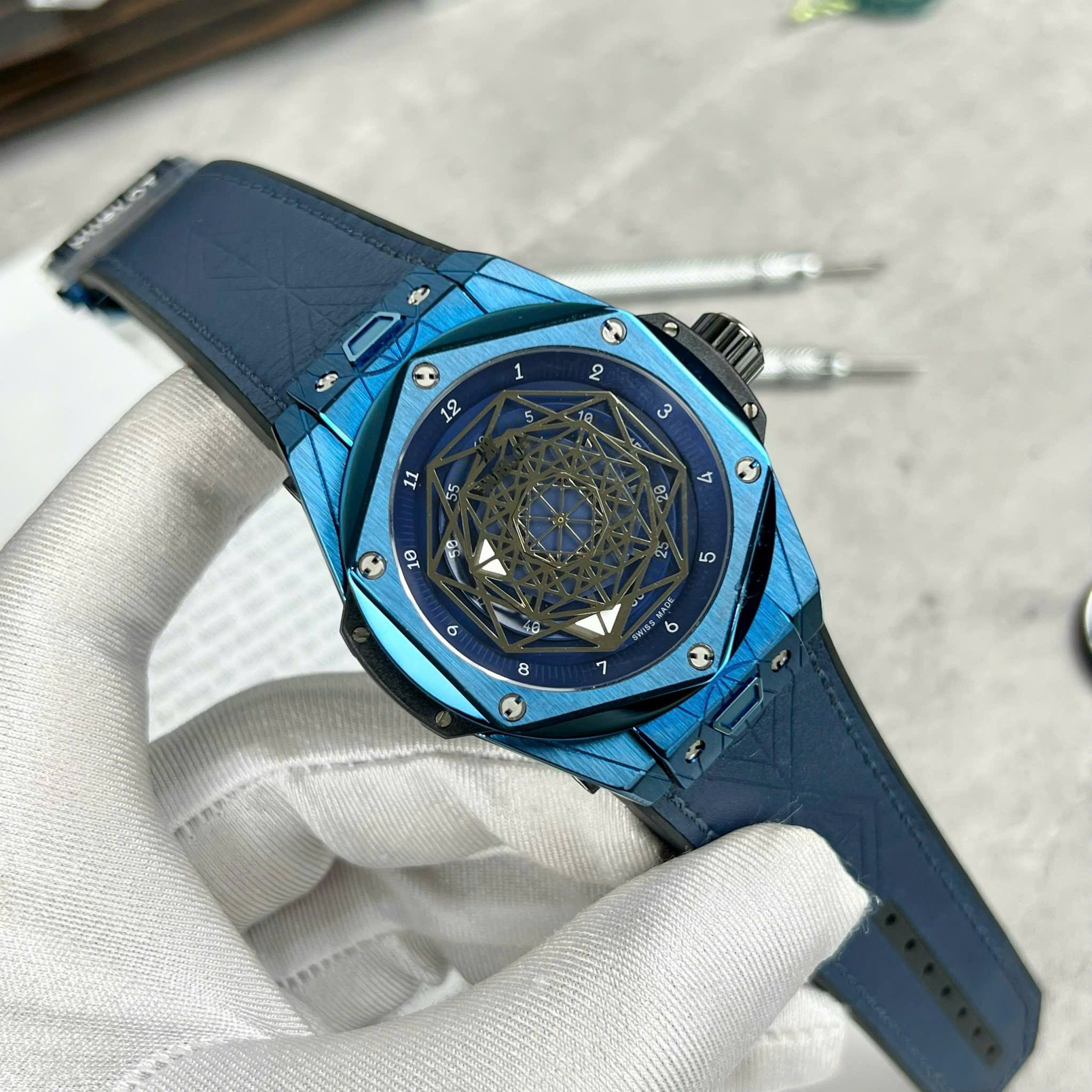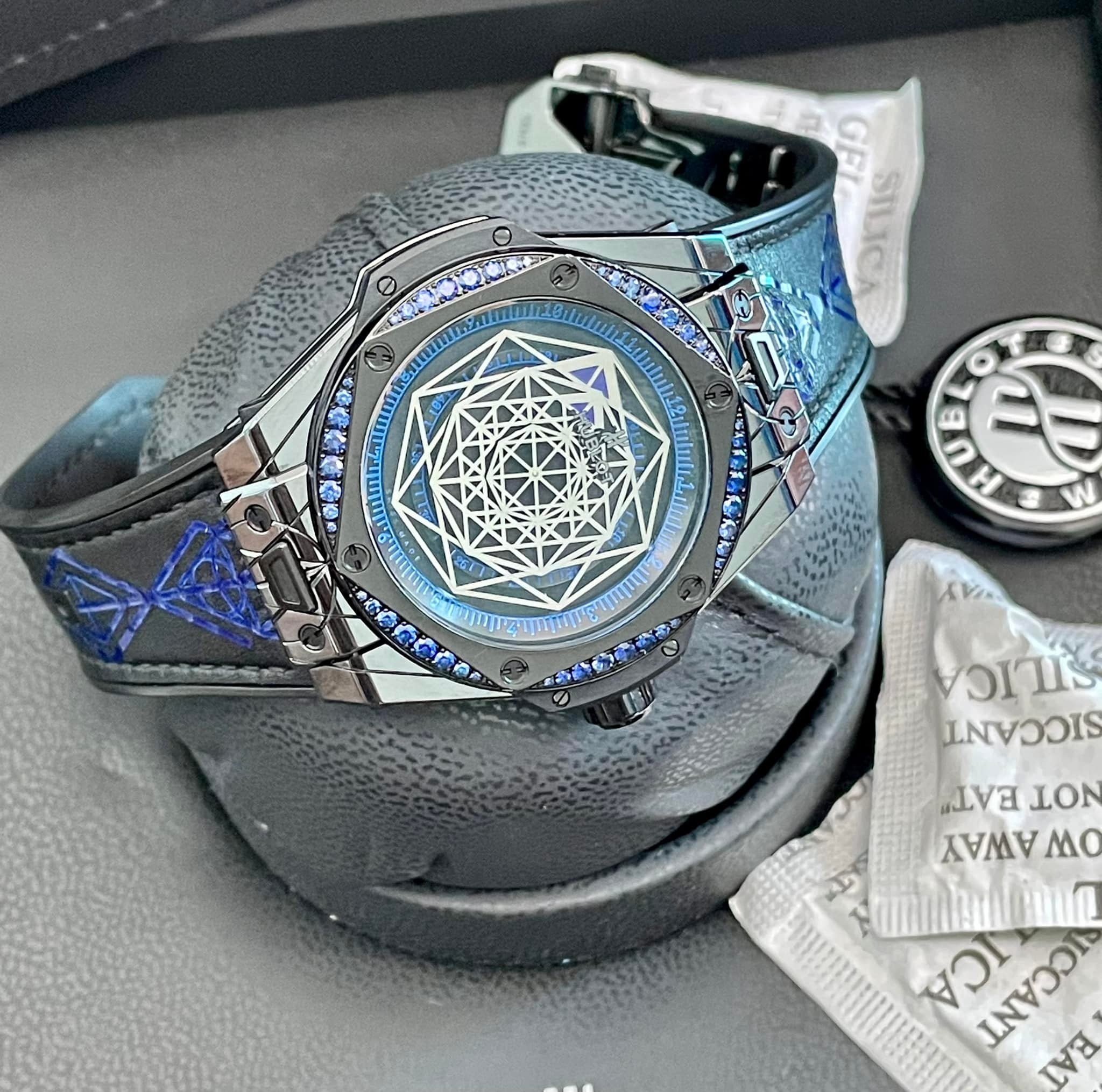 Đồng hồ Big Bang Blue Sang ra mắt vào đầu năm 2016. Đây là sự kết hợp giữa thương hiệu Hublot và nghệ sĩ xăm hình Thụy Sĩ Maxime Buchi, người sáng lập studio Sang Blue. Thiết kế đồng hồ gây ấn tượng người nhìn bởi đường cắt 3D tinh xảo tạo thành khối hình học đa chiều xuyên suốt mặt số, viền vỏ và dây đeo, mang đậm phong cách nghệ thuật đương đại.