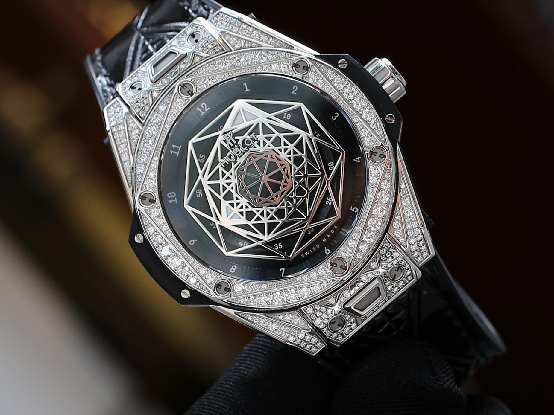 Mặt số thiết kế theo hình học đa tầng với các hình tam giác và chữ nhật cắt chồng lên nhau, được bảo vệ bởi kính sapphire chống trầy xước cao cấp. Đồng hồ sử dụng bộ máy cơ tự động HUB1710 với khả năng dự trữ năng lượng đến 50 giờ, đảm bảo hoạt động chính xác.