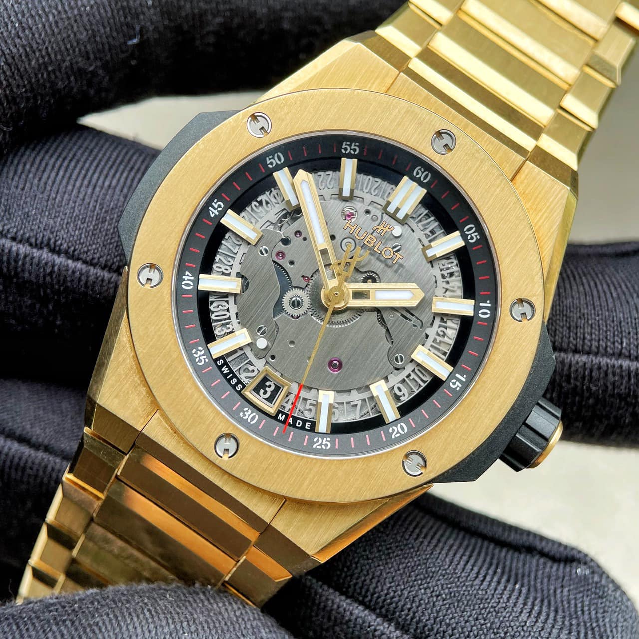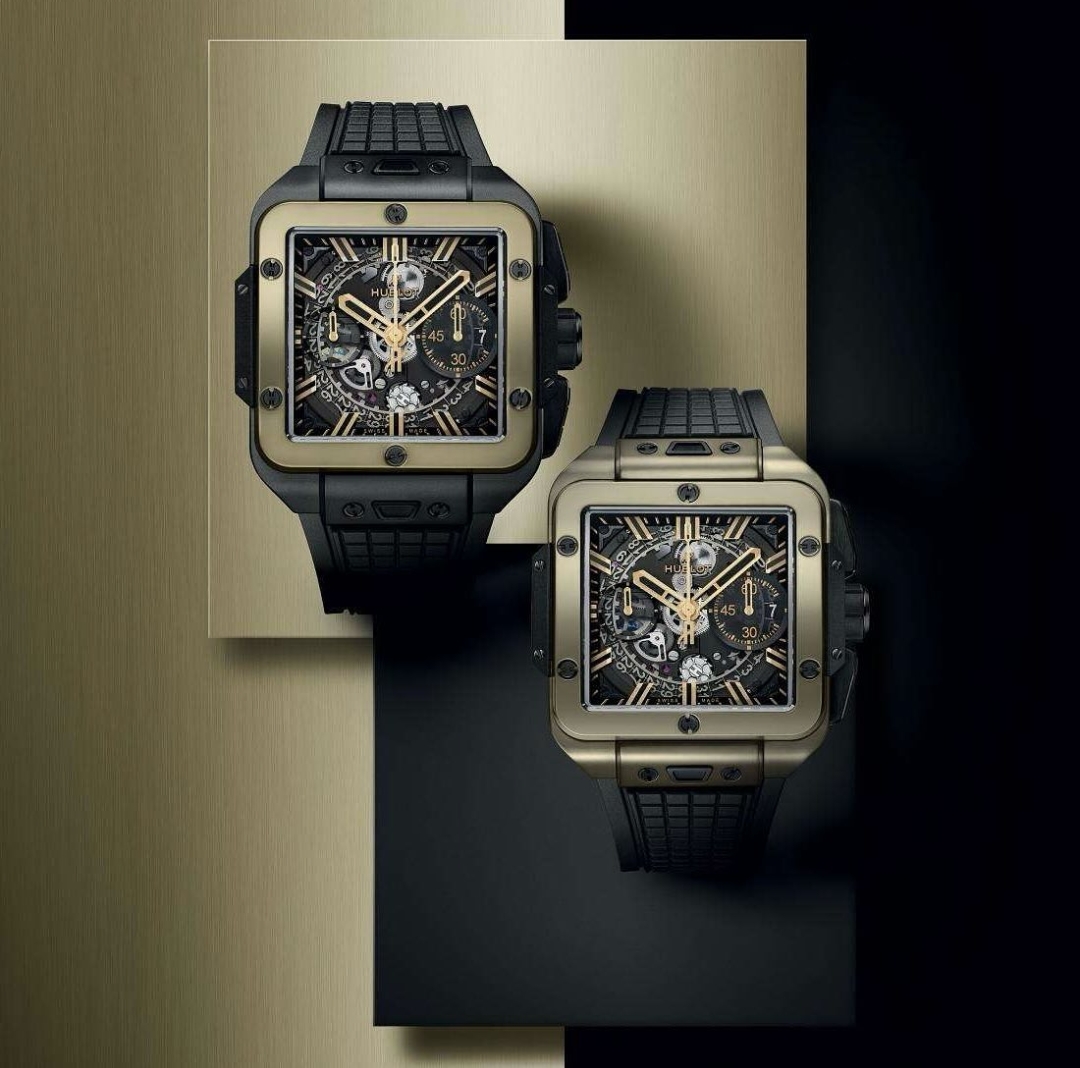 Trên chiếc Square Bang Unico, Magic Gold được sử dụng để chế tác các chi tiết quan trọng như viền bezel, kim và cọc số, tạo điểm nhấn sang trọng và đẳng cấp.