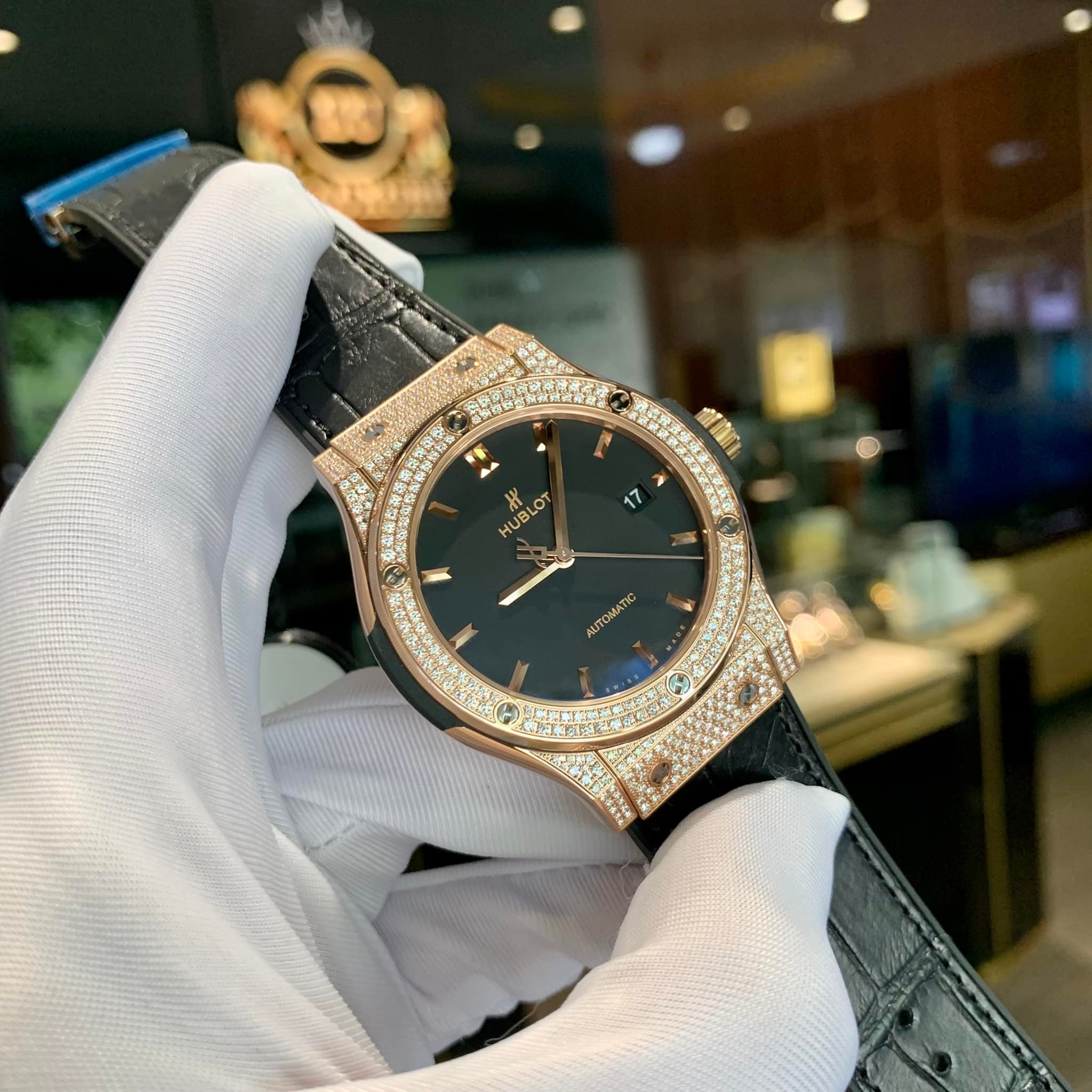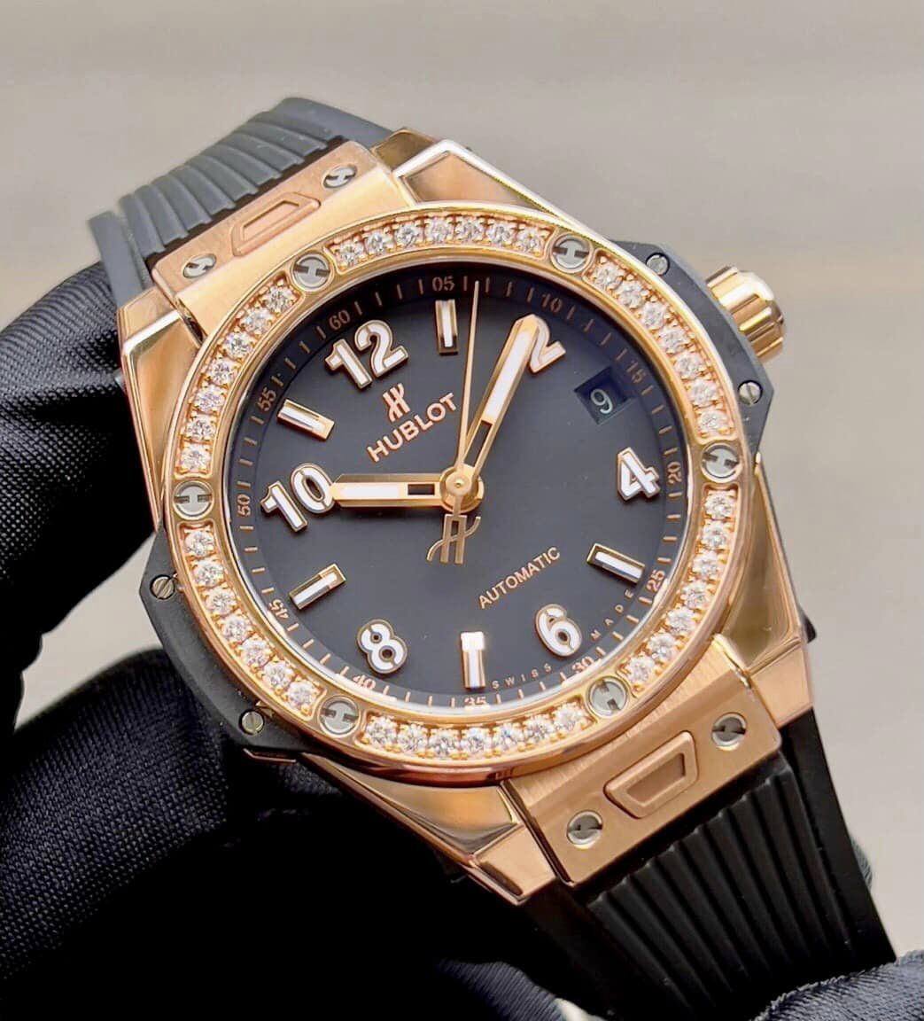 Chiếc đồng hồ nổi bật với vành bezel đúc nguyên khối từ vàng 18K cao cấp cùng với hơn 100 viên kim cương tự nhiên. Với tông màu đen vàng chủ đạo mang đến vẻ đẹp nhẹ nhàng, thanh lịch và vô cùng đẳng cấp.