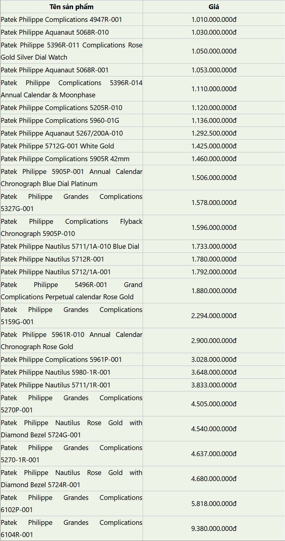 Bạn đang thắc mắc về giá đồng hồ Patek Philippe mới nhất hiện nay? Đây là loại đồng hồ được đánh giá là một trong những thương hiệu hàng đầu thế giới. Chính vì thế, dù mức giá khá cao nhưng chúng vẫn luôn mang lại sức hấp dẫn không thể chối từ. Hãy cùng theo dõi bài viết sau đây để tìm hiểu thêm những thông tin thú vị nhé!