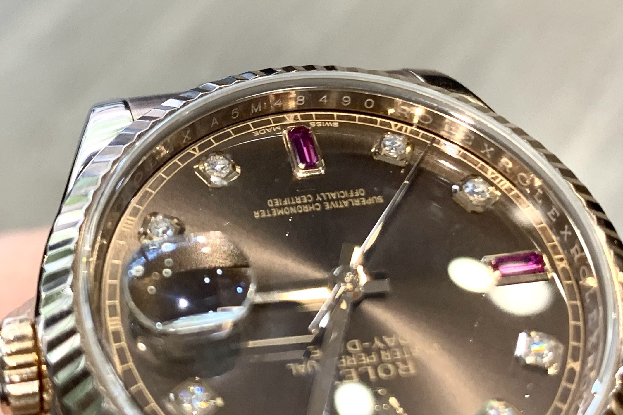 Lịch ngày của Rolex thường được trang bị kính lúp với độ phóng khoảng 2,5 lần. Đây được coi như quy ước ngầm giữa nhà bán với người mua về độ chính hãng của sản phẩm. Do vậy khi mua đồng hồ Rolex bạn nhớ quan sát xem có thấy đặc điểm trên không.