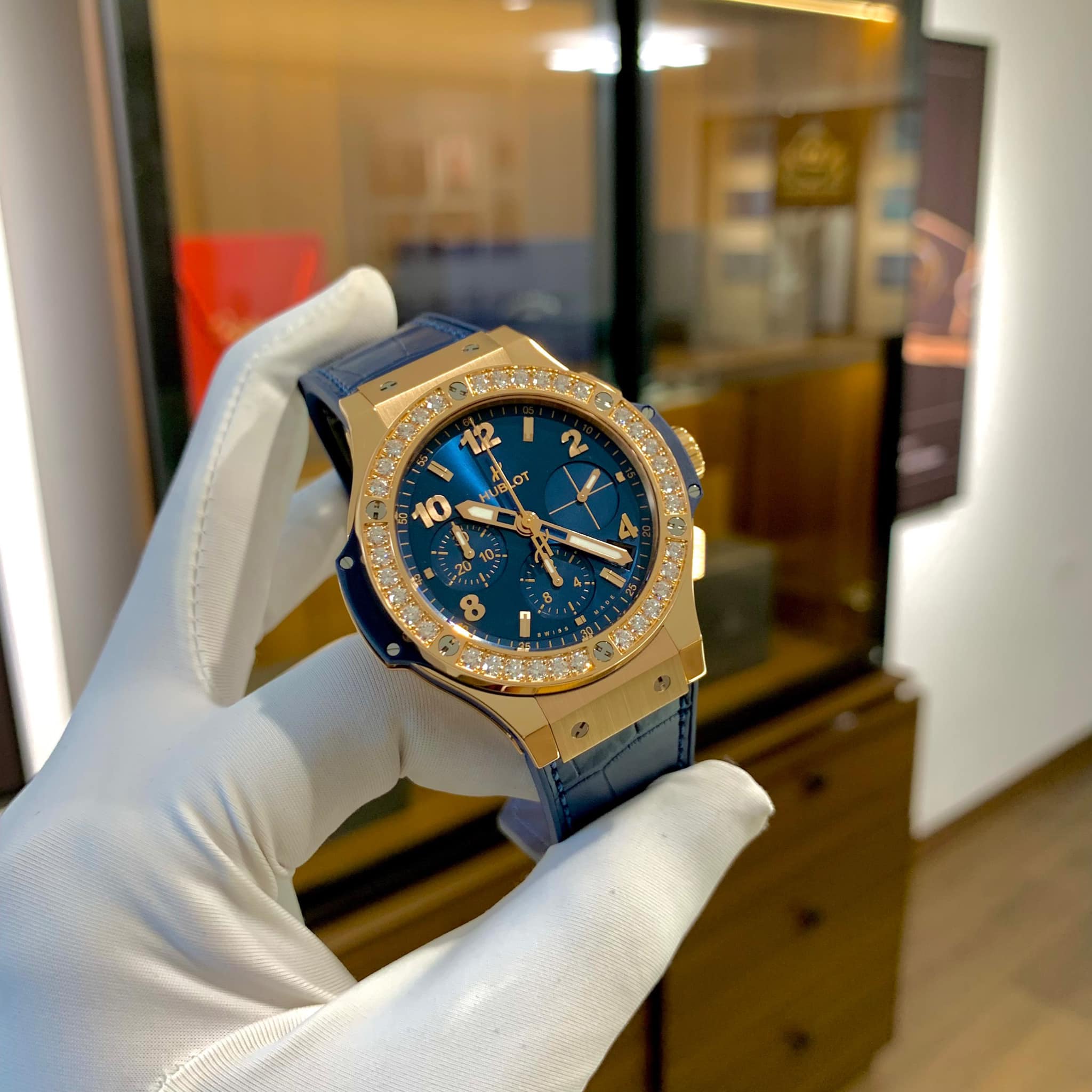 Là một dân chơi đồng hồ thì chắc chắn không thể nào không biết tới siêu phẩm Hublot Big Bang Gold Diamonds. Phiên bản này là sự kết hợp giữa màu xanh biển với vàng Gold tuyệt đẹp. Tô điểm thêm đó là hàng chục viên kim cương đính xung quanh vành bezel mang lại khả năng phản xạ ánh sáng ấn tượng.
