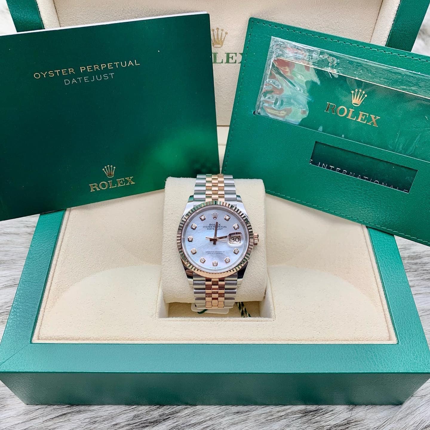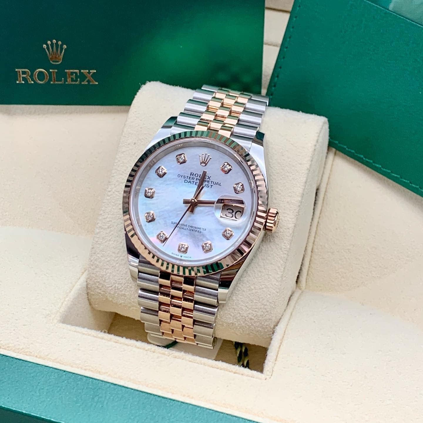 Không những thế, với từng loại đá xà cừ thì ánh sáng phản chiếu màu sắc khác nhau. Thế nên có thể nói chiếc đồng hồ Rolex 126331 Datejust 41mm Everose Gold Oyster này là sản phẩm độc nhất, có 1 – 0 – 2.