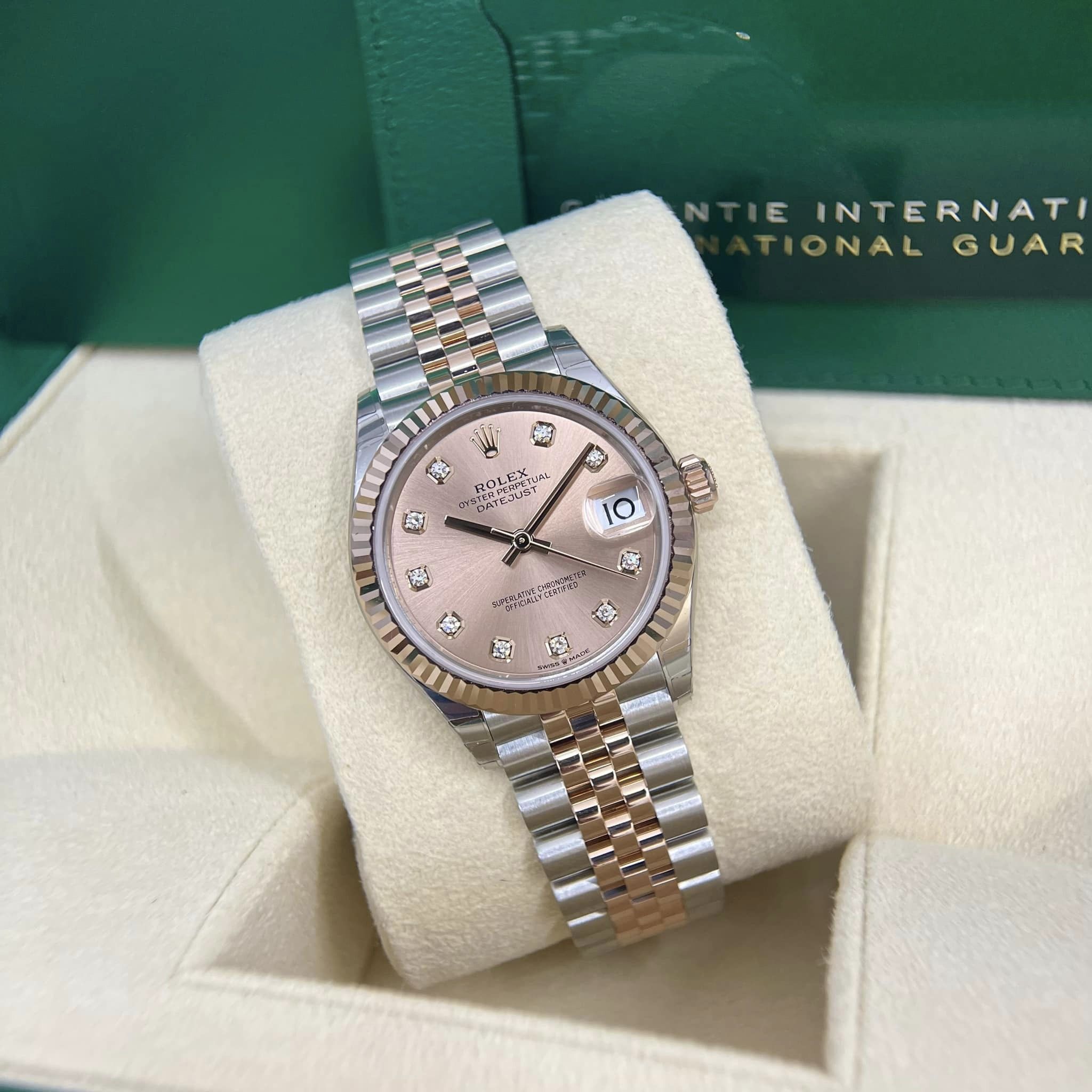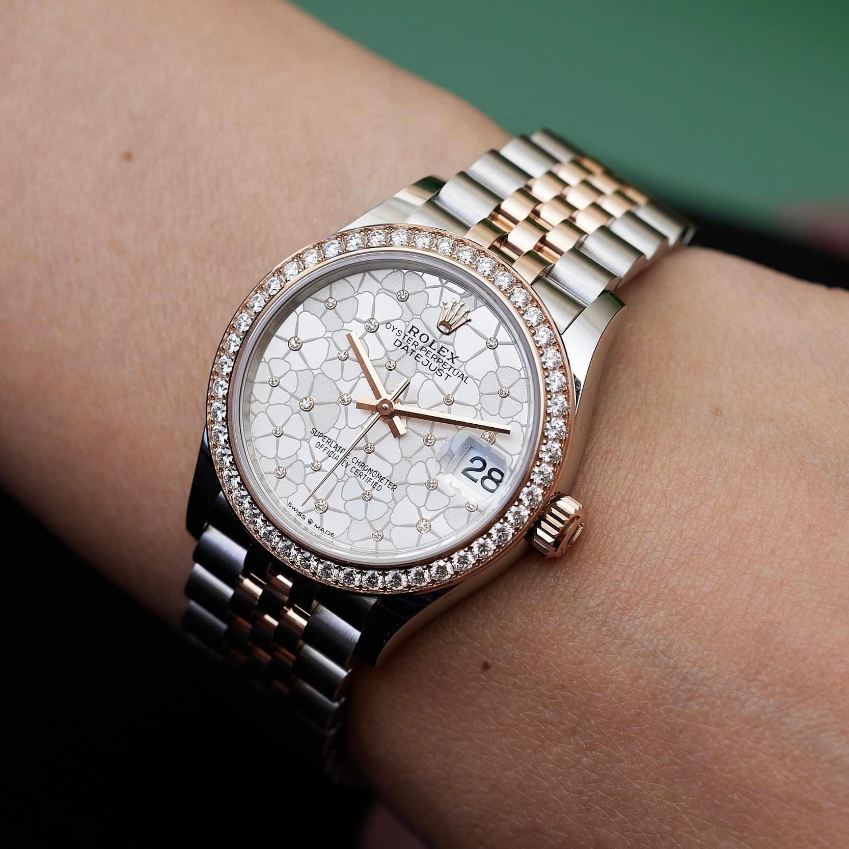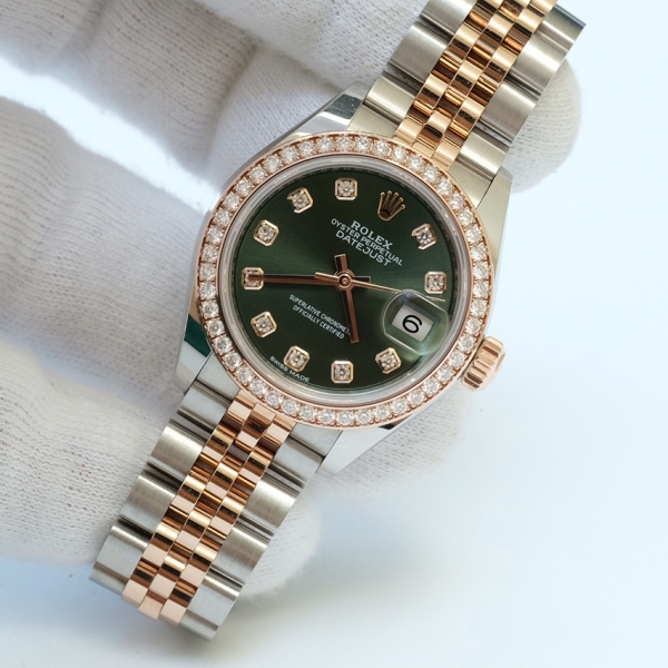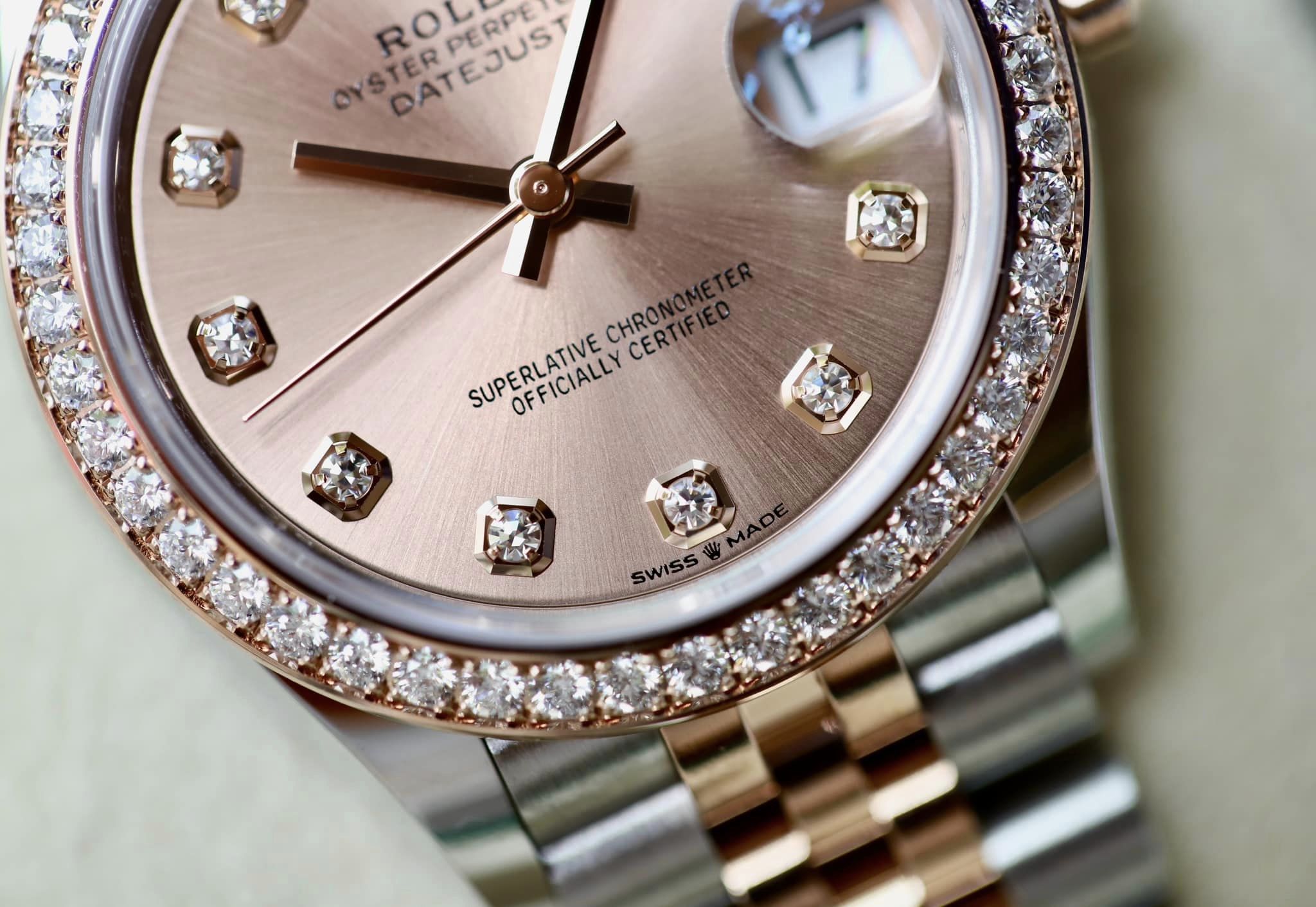 Nhìn vào mặt đồng hồ Đồng Hồ Rolex Oyster Perpetual Datejust 31mm 278381, bạn sẽ bị ấn tượng bởi nét đẹp có phần giản dị nhưng lại rất thanh thoát, nhẹ nhàng. Bộ kim đơn nét được chế tác từ vàng Everose mang đến đặc trưng tối giản của dòng Datejust. Vành của sản phẩm được chế tác từ hai chất liệu là vàng Everose và kim cương tự nhiên được sử dụng để nạm quanh phần vành, tạo nên giá trị đắt đỏ cho chiếc đồng hồ Rolex Oyster Perpetual Datejust 31mm 278381 này.