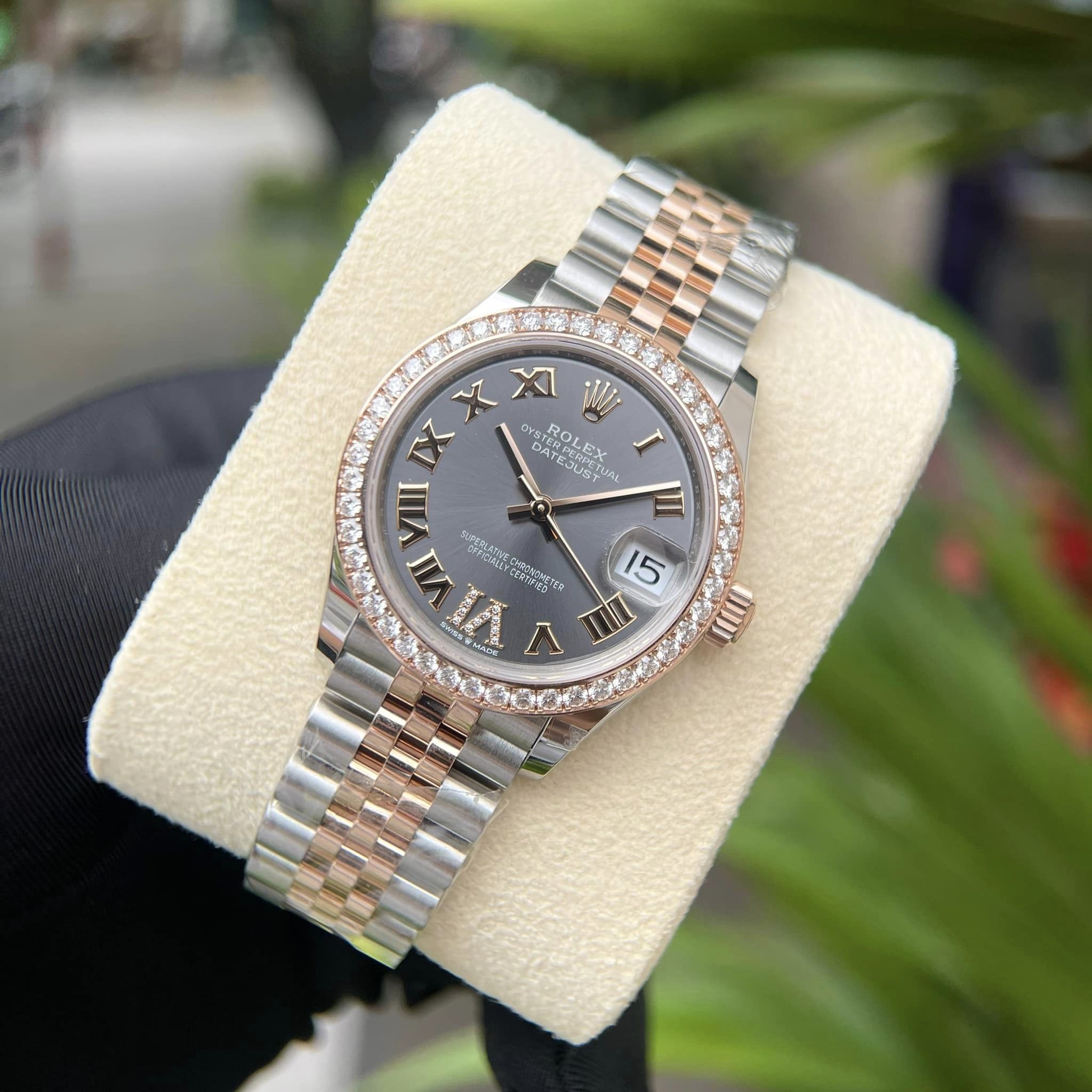 Rolex Oyster Perpetual Datejust 31mm 278381-012 có lẽ là chiếc đồng hồ giao thoa giữa vẻ đẹp cổ điển và nét hiện đại nhất trong bộ sưu tập của Rolex. Các cọc số được thể hiện bằng số La Mã, với mốc giờ 12 là biểu tượng vương miện quen thuộc như một lời ngầm khẳng định đẳng cấp chế tác của thương hiệu. Mốc giờ số 6 được đính đá quý tăng thêm độ tinh tế và mềm mại cho sản phẩm.