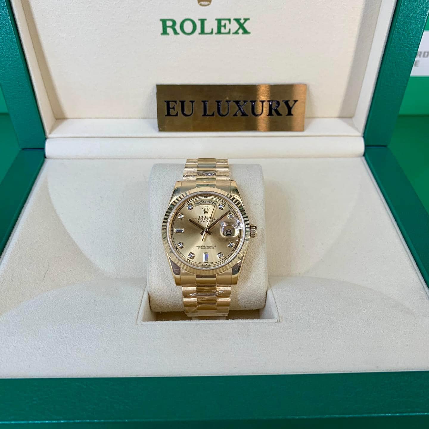 Chiếc đồng hồ này là sự kết hợp giữa màu vàng hồng và màu xanh lá cây. Vỏ vàng Everose 18K có mặt số màu xanh ô liu thanh lịch, khung fluted bezel và dây đeo president làm toát lên vẻ sang trọng. Mặt đồng hồ màu xanh lá cây hiển thị điểm đánh dấu giờ và kim mỏng bằng vàng.