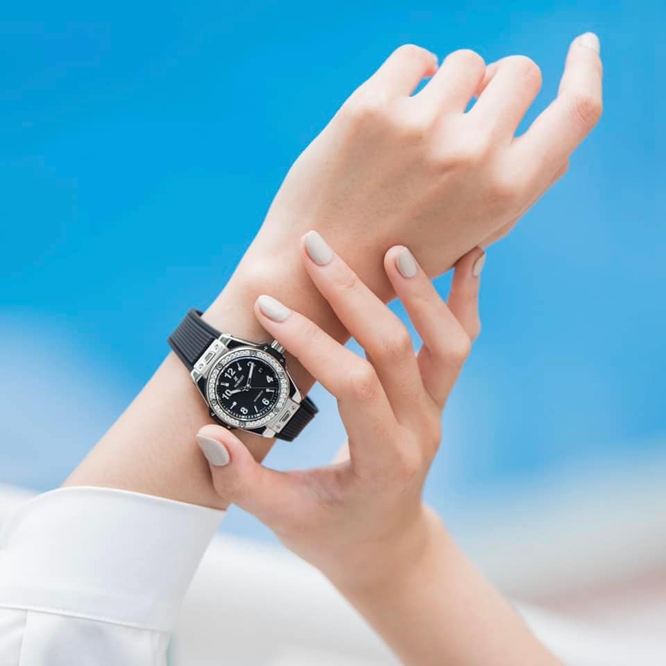 Đây là thiết kế nổi bật bởi những viên kim cương lấp lánh. Điểm nhấn ấn tượng cho thiết kế này là bộ dây đeo cao su được thương hiệu sử dụng vàng 18k. Sản phẩm này làm tôn lên được vẻ quý phái, sang trọng và rất phù hợp với những quý cô sành điệu.