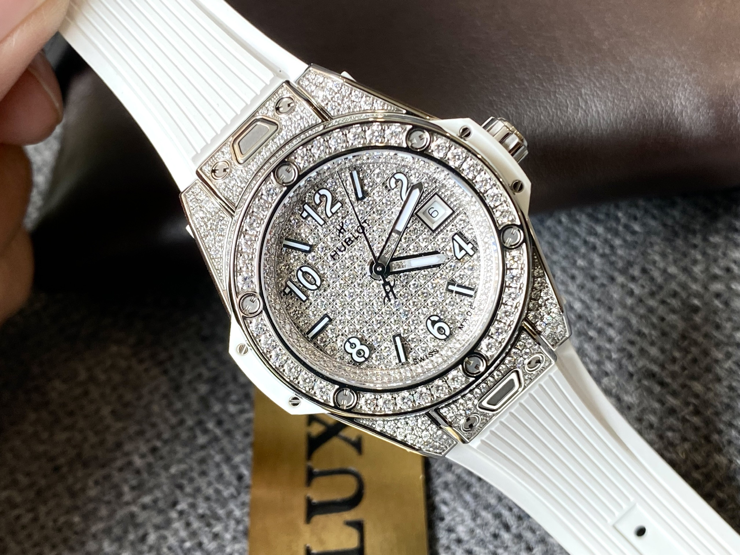 Những con ốc trên mặt đồng hồ: Những chiếc đồng hồ Hublot nữ chính hãng đều có những con ốc vít hình chữ H trước mặt, trên viền bezel và trên phần vấu gắn dây của đồng hồ.