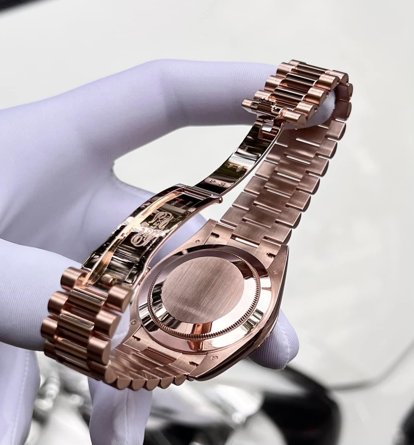 Về cơ bản chiếc đồng hồ vẫn sở hữu đầy đủ những thiết kế đặc trưng của dòng Rolex Day-Date. Trước hết là thiết kế đai kính rãnh và vành đồng hồ để đảm bảo siết chặt và chống nước ở độ sâu 100m.