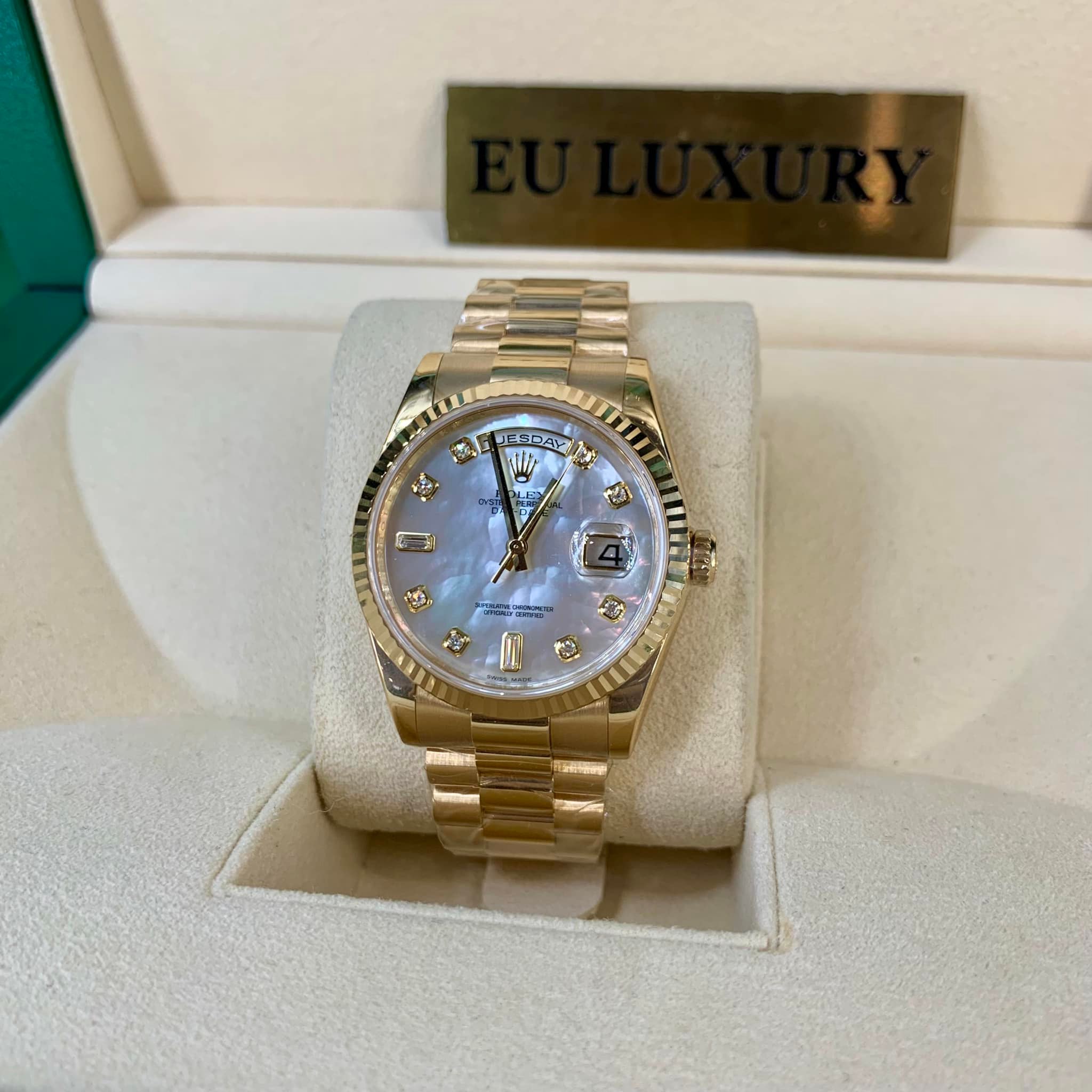 Mỗi chiếc đồng hồ Rolex Day-Date là một tác phẩm nghệ thuật với thiết kế vượt thời gian, phù hợp với những ai yêu thích sự sang trọng và tinh tế. Hãy đến EU Luxury để chọn cho mình chiếc đồng hồ hoàn hảo nhất.