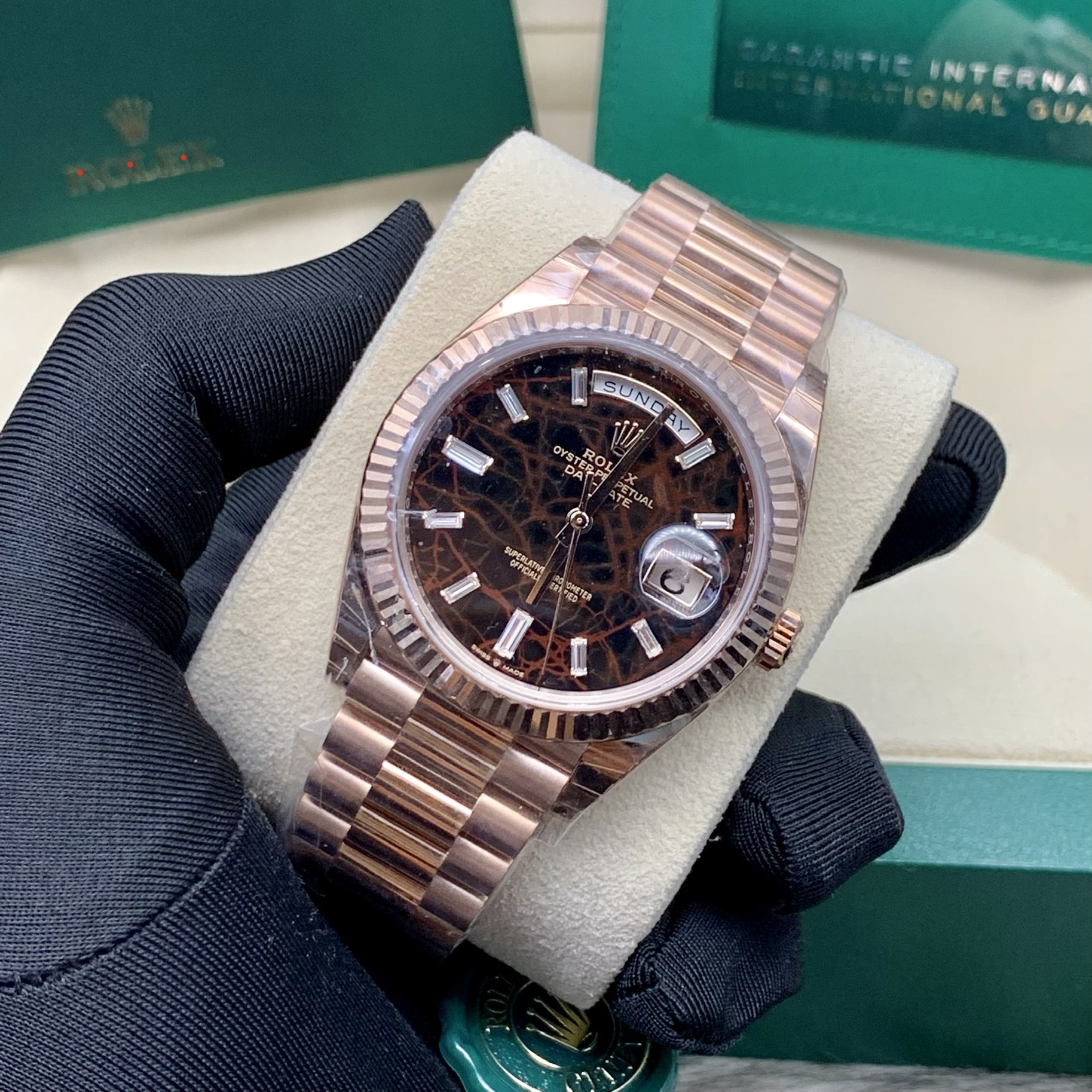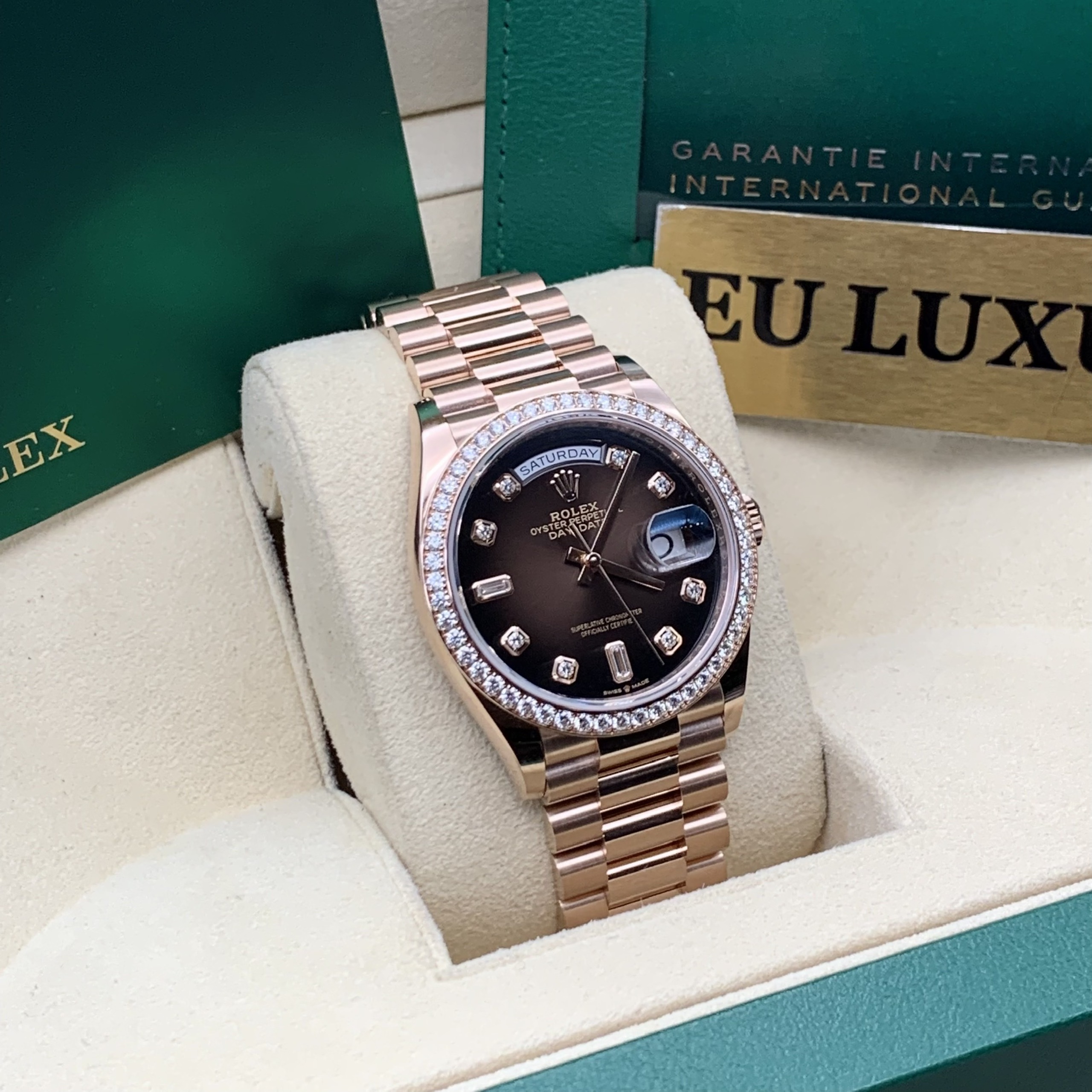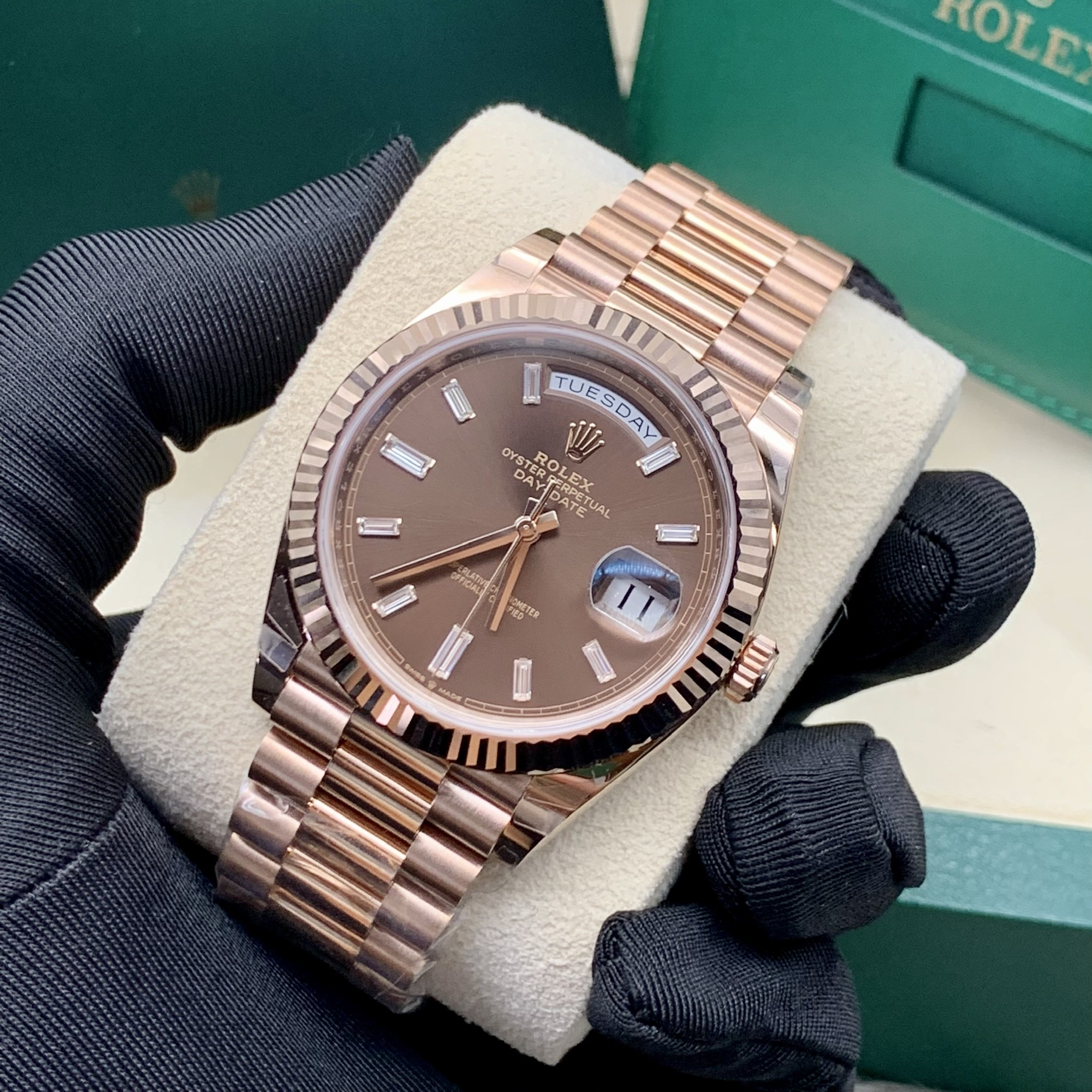 Đây là thành viên nổi bật nhất của thương hiệu Rolex. Dây đeo được thiết kế độc quyền, liên kết 3 mảnh bán nguyệt tạo nên phiên bản độc đáo. Chiếc đồng hồ hiển thị tên các thứ ngày trong tuần đầy đủ. Chúng được sử dụng nhiều bởi các nguyên thủ quốc gia trên thế giới. Day-Date được chào bán với màn hình hiển thị ngày cài đặt trước cho nhiều ngôn ngữ.