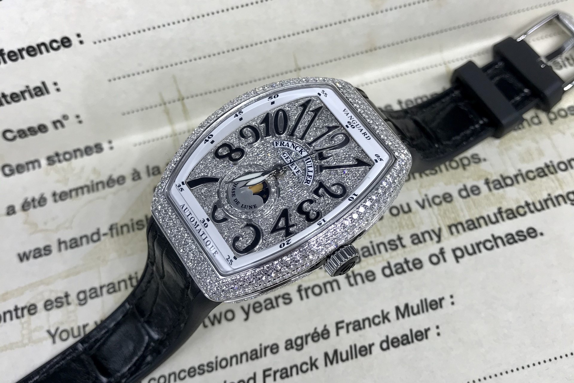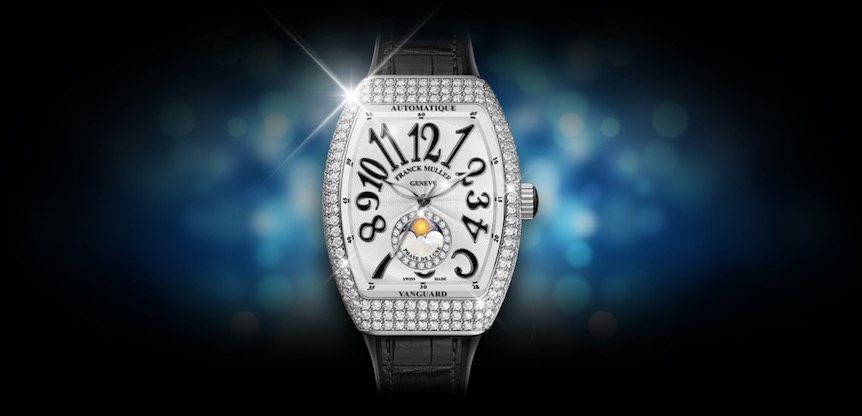 Đối với Franck Muller thì mặt đồng hồ hình Curvex luôn mang một sức mạnh thẩm mỹ tuyệt vời. Đó là lý do mà vì sao cả mảng đồng hồ nam và đồng hồ nữ đều được hãng ứng dụng triệt để. Chiếc đồng hồ V32 Moonphase Vanguard Lady là một sản phẩm rất phù hợp với những quý cô ưu thích sự đơn giản, sang trọng mà tinh tế. Đĩa lịch mặt trăng được nạm lên rất nhiều viên kim cương quý giá. Chứng minh đẳng cấp không gì thay thế được của Franck Muller.