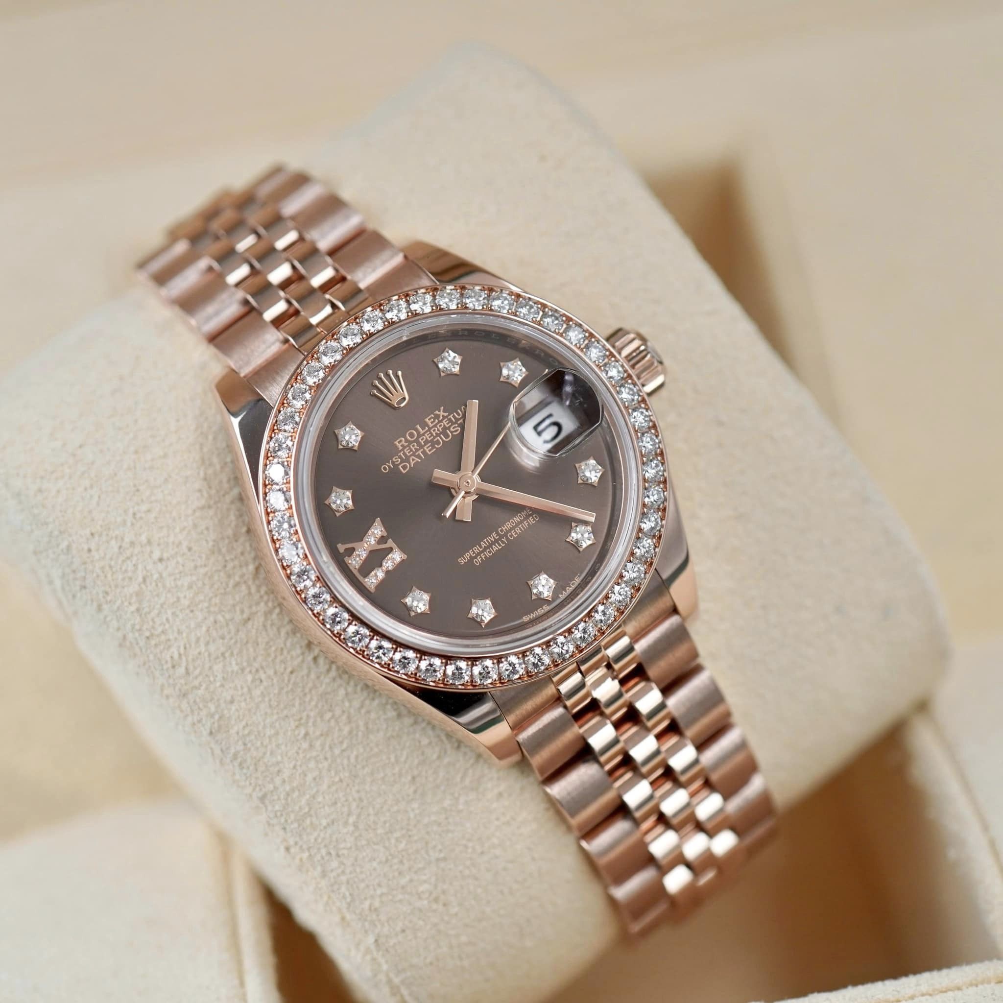 Nổi bật trên chiếc đồng hồ là mặt số tông màu Chocolate đẹp mắt với các cọc số được gọt cắt thành hình chữ nhật. Cửa sổ chỉ ngày được thiết kế ở vị trí 3 giờ cùng logo thương hiệu ở góc 12 giờ quen thuộc của dòng Datejust. Tô điểm thêm là bộ kim cũng được làm từ vàng Everose. Bộ dây Jubilee với mối nối 5 mảnh tạo thành 3 dải màu cực kỳ bắt mắt.