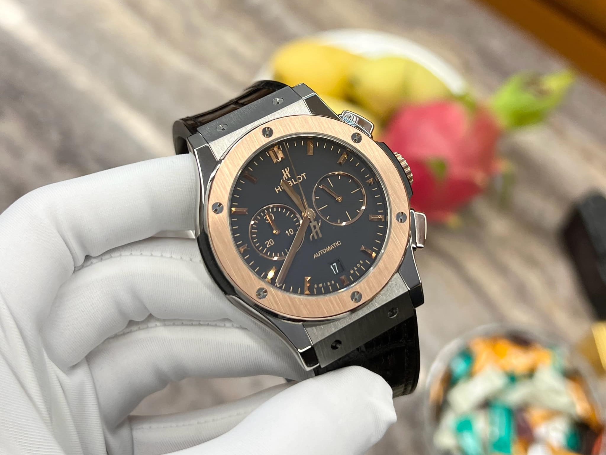Ví dụ, một chiếc đồng hồ Hublot Classic Fusion Automatic 42mm có mặt số đen được demi vàng hồng Titanium. Sự kết hợp này không chỉ tạo nên vẻ đẹp sang trọng mà còn mang lại tính độc đáo và thu hút cho chiếc đồng hồ.