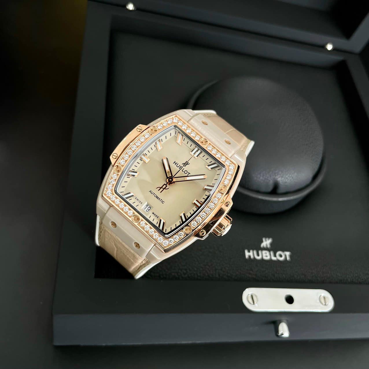 Đây là một thiết kế hiện đại và tinh tế, mang lại vẻ đẹp thanh lịch và trang nhã. Tông vàng có thể là vàng kim hoặc vàng hồng, kết hợp với tông trắng từ ceramic trắng. Đồng hồ Hublot demi vàng – trắng là sự lựa chọn hoàn hảo cho những ai yêu thích phong cách nhẹ nhàng nhưng không kém phần sang trọng và nổi bật.