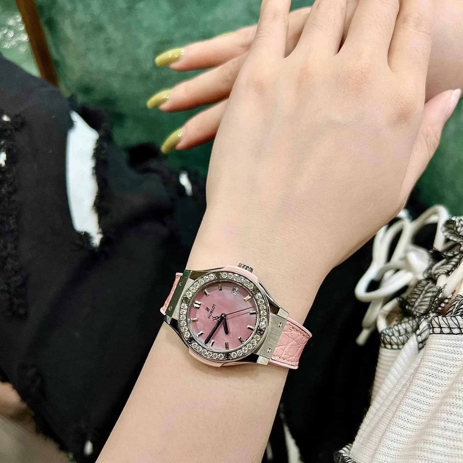 Hublot nữ dây da thường có thiết kế mặt đồng hồ độc đáo, kết hợp với các chi tiết sang trọng như kim chỉ mạ vàng, mặt số trang trí bằng đá quý hoặc kim cương. Các mẫu đồng hồ này rất đa dạng về kiểu dáng và màu sắc, giúp người dùng dễ dàng lựa chọn theo sở thích cá nhân.