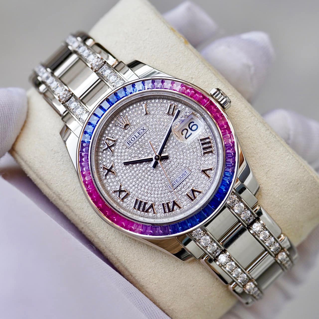 Pearlmaster là kiểu dây đeo được sản xuất dành riêng cho phái đẹp. Sở hữu 5 mối nối kim loại và nhiều đá quý được đính trên dây giúp cổ tay của khách hàng dường như phát sáng. Khi đeo đồng hồ Rolex dây kim loại Pearlmaster, chị em sẽ có cảm giác như đeo vòng trang sức cao cấp giúp tôn lên vẻ đẹp của người phụ nữ.