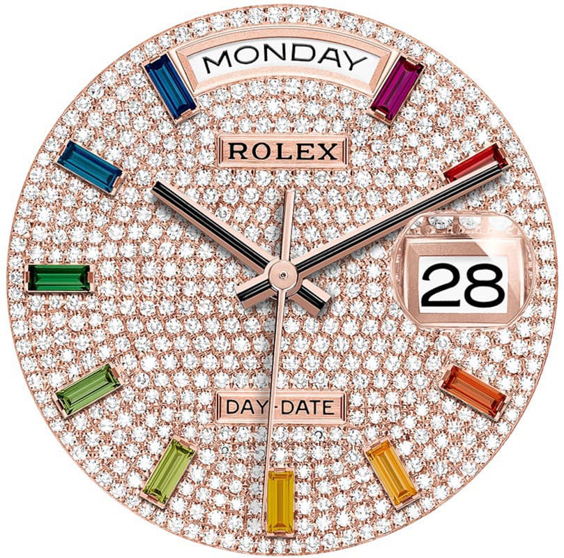 Chiếc đồng hồ được thiết kế với tông màu vàng hồng từ vàng Everose cao cấp. Mặt đồng hồ được chế tác thủ công từ kính ngọc bích cực kỳ giá trị. Phần vành bezel vẫn là thiết kế rãnh đặc trưng của nhà Rolex. Nhưng điểm nhấn đó chính là thiết kế rất nhiều viên đá quý được nạm ở mặt số. Chúng tạo ra hiệu ứng ánh sáng cực kỳ bắt mắt và thu hút.