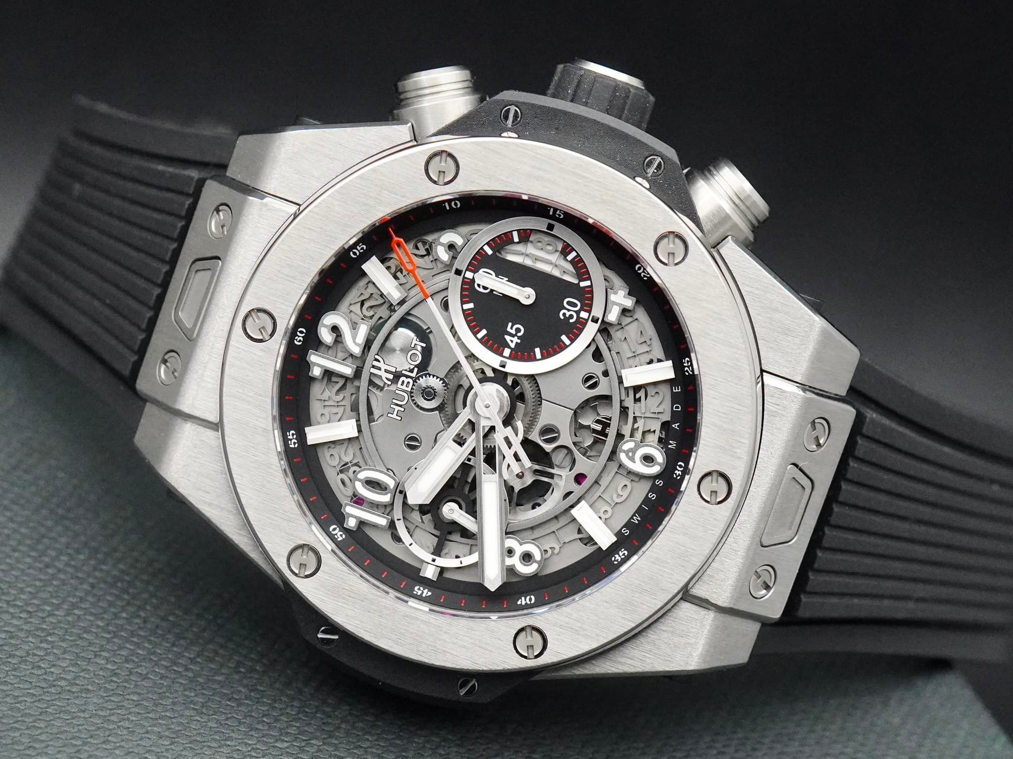 Nói lời chào với Hublot Big Bang Big Bang Unico Titanium, mẫu đồng hồ được làm bằng khung xương, đây deo cao su đen, chốt cài và gờ sa tanh.