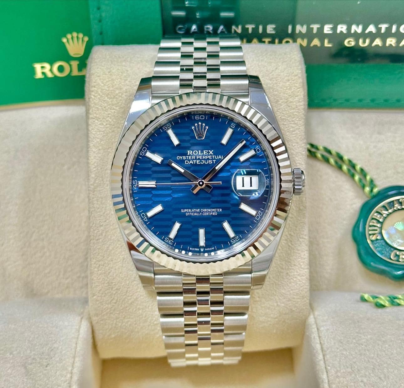 Một trong những điểm nổi bật của Datejust 41 Blue là mặt số màu xanh lam. Màu xanh lam là một màu sắc sang trọng và tinh tế, mang lại cảm giác thanh lịch và trang nhã cho người đeo. Mặt số được chải tia tinh tế, tạo nên hiệu ứng bắt sáng ấn tượng.