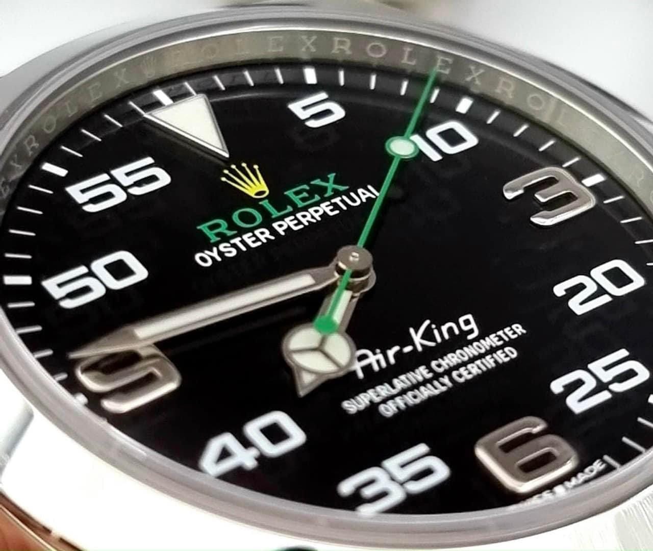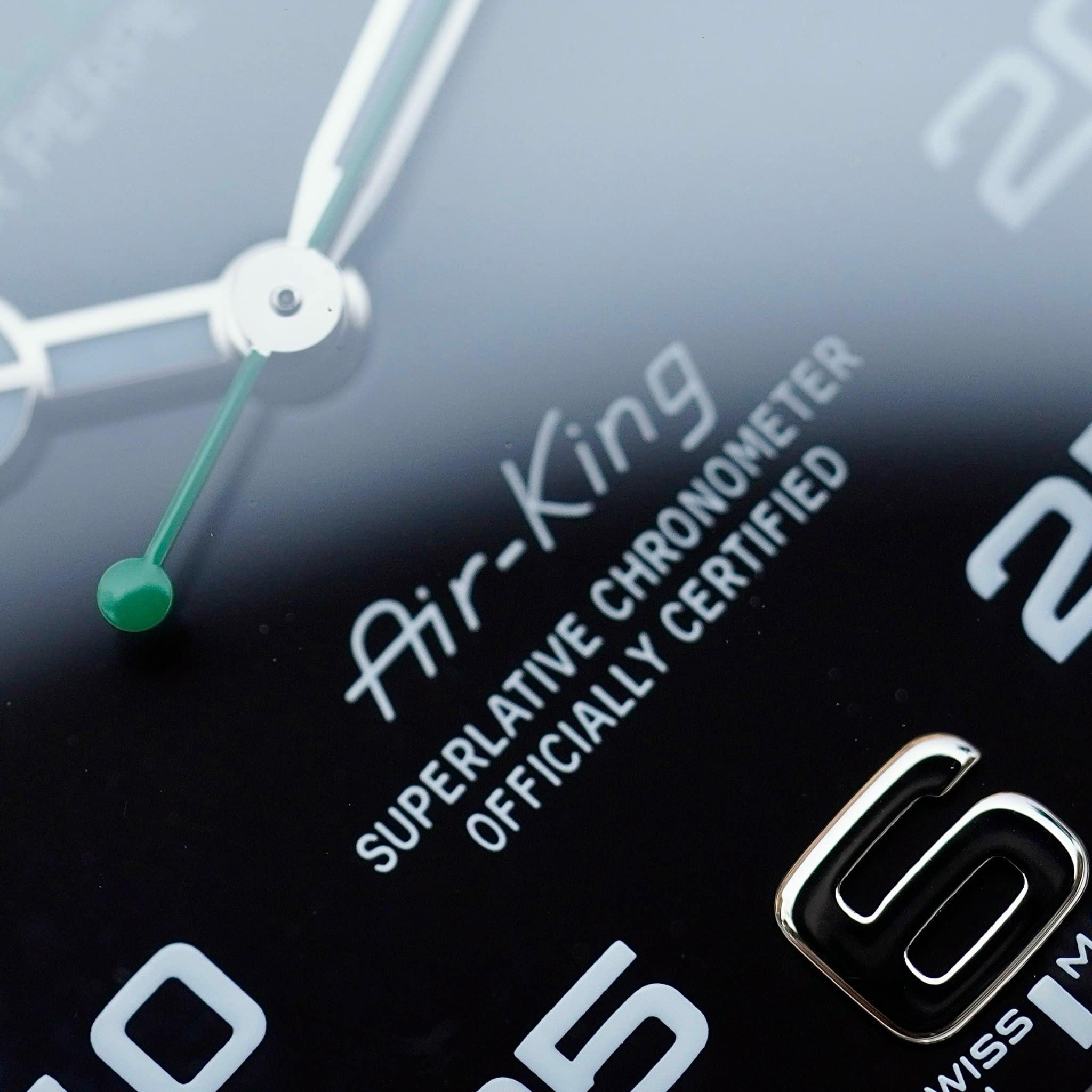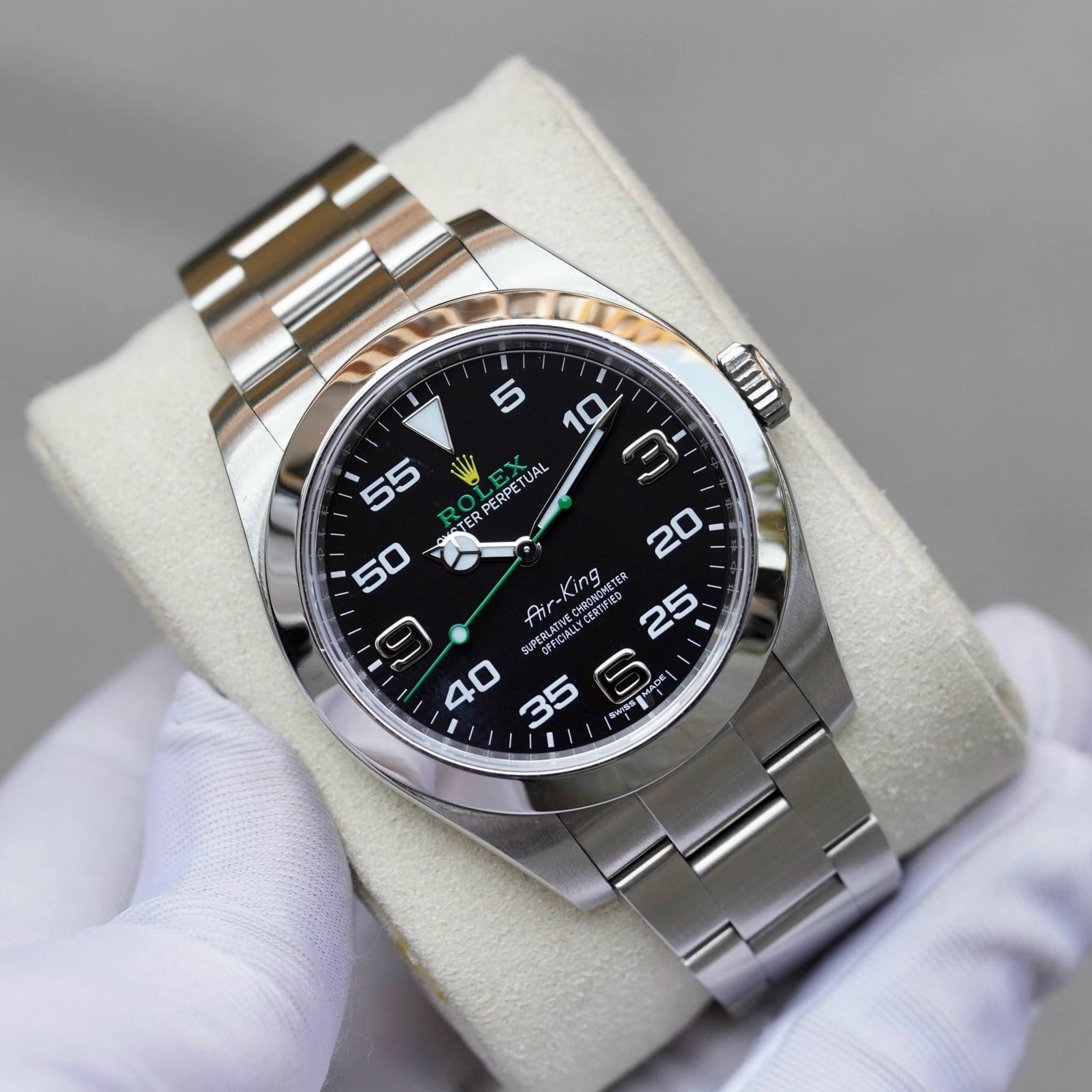 Air-King là một chiếc đồng hồ phi công cổ điển được thiết kế cho các phi công thương mại. Nó có mặt số màu đen với các chữ số La Mã lớn, kim giờ và kim phút thanh mảnh, và kim giây trung tâm. Vỏ thép không gỉ 40mm của nó có thiết kế đơn giản và kín đáo, và nó được trang bị bộ máy tự động lên dây cót Caliber 3130 của Rolex.
