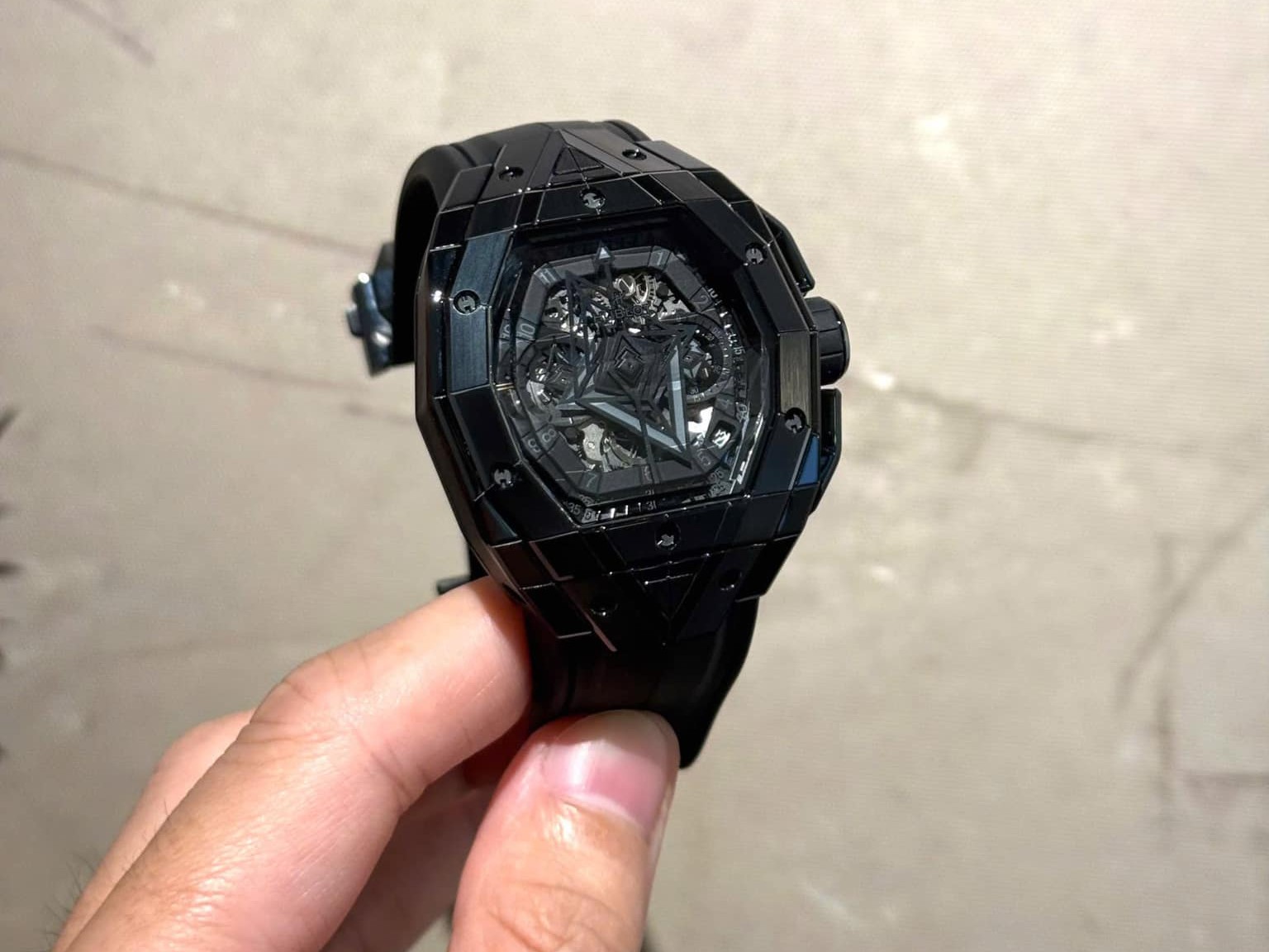 Sự hiện diện của Hublot Sang Bleu II All Black mang đến vẻ đẹp bí ẩn và tối giản. Đồng hồ được phủ đen từ mặt số, vỏ đến dây đeo tạo nên vẻ ngoài cuốn hút. Làm bằng chất liệu ceramic chống trầy xước với độ bền cao. Dù màu sắc tối giản, thiết kế mặt số phức tạp nhưng vẫn làm nổi bật được cá tính mạnh mẽ của người đeo. Phiên bản này rất phù hợp với những vị khách thích sự đơn giản nhưng không nhàm chán.