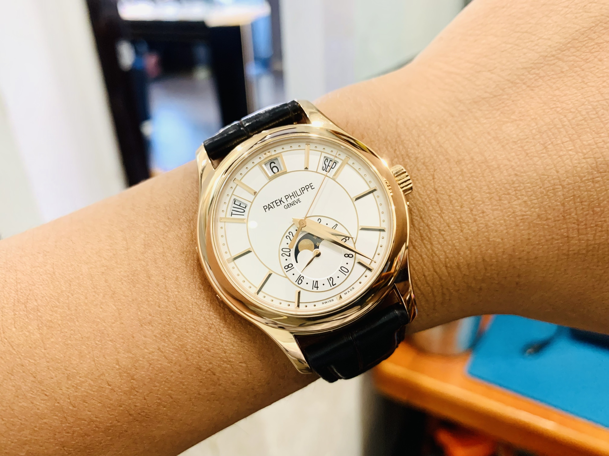 Ngoài ra dây đeo đồng hồ của hãng Patek Philippe thường được làm bằng da cá sấu. Da được xử lý kỹ càng, nhiều công đoạn tạo cảm giác đeo vừa vặn, êm ái.