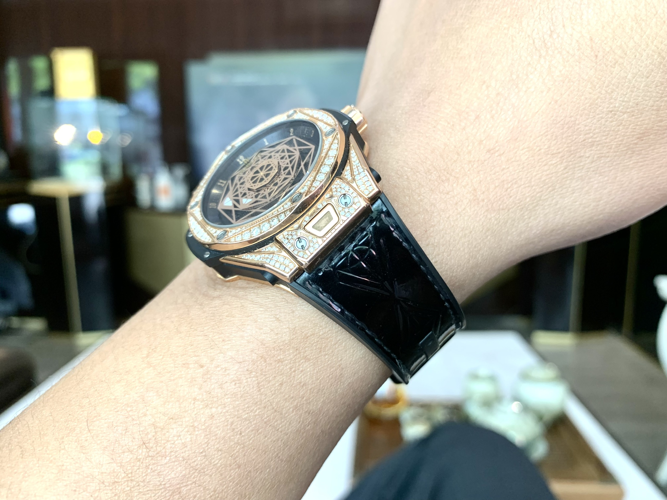 Bên cạnh đó, điểm nhấn lớn nhất trên sản phẩm đó chính là 50 viên kim cương sáng bóng. Chúng tạo nên cảm giác vô cùng sang trọng, tạo nên khí chất, đẳng cấp dành cho người sở hữu. Mức giá tham khảo cho sản phẩm đồng hồ Hublot này là 325 triệu đồng.