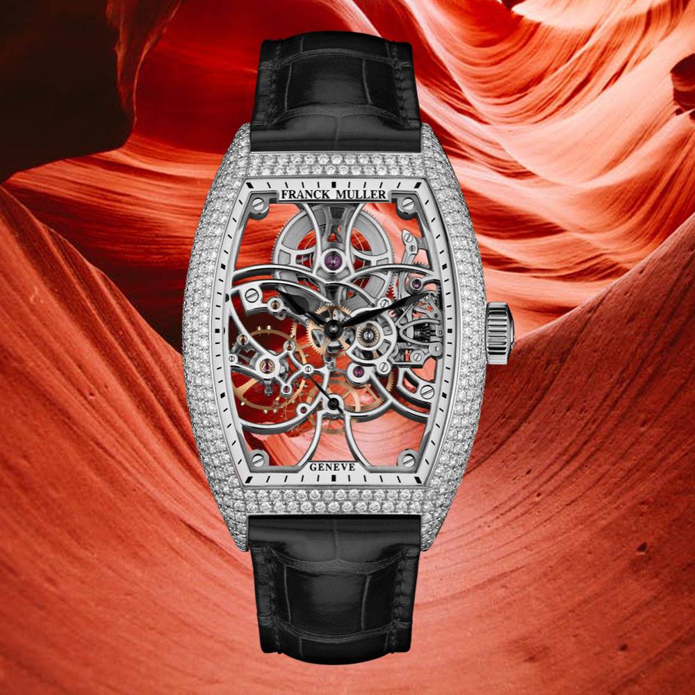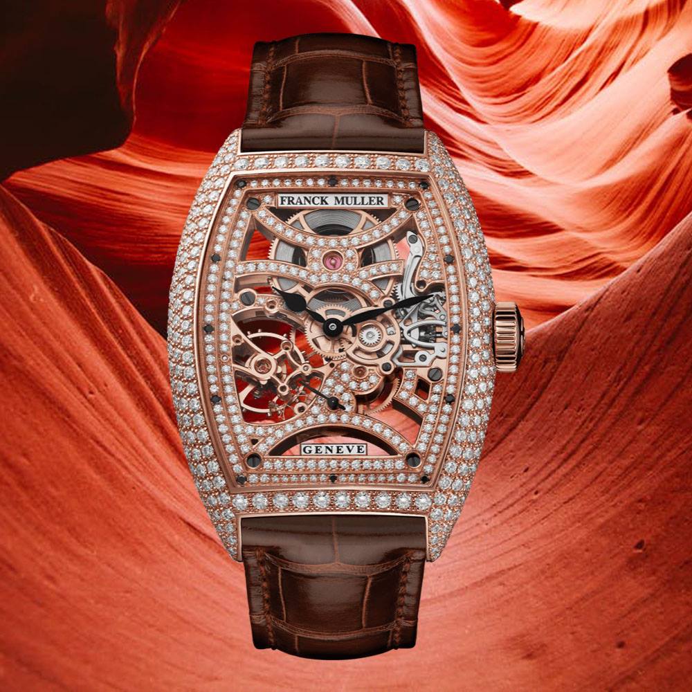 Một trong những mẫu ấn tượng nhất chính là Franck Muller Cintrée Curvex Skeleton 8880 B S6 SQT D MVT D Gold, kiệt tác kết hợp giữa sự sang trọng và cơ khí tinh vi. Mẫu đồng hồ này sở hữu bộ vỏ bằng vàng hồng 18K nguyên khối kết hợp với vành bezel đính kim cương lộng lẫy, tạo nên vẻ ngoài đẳng cấp.
