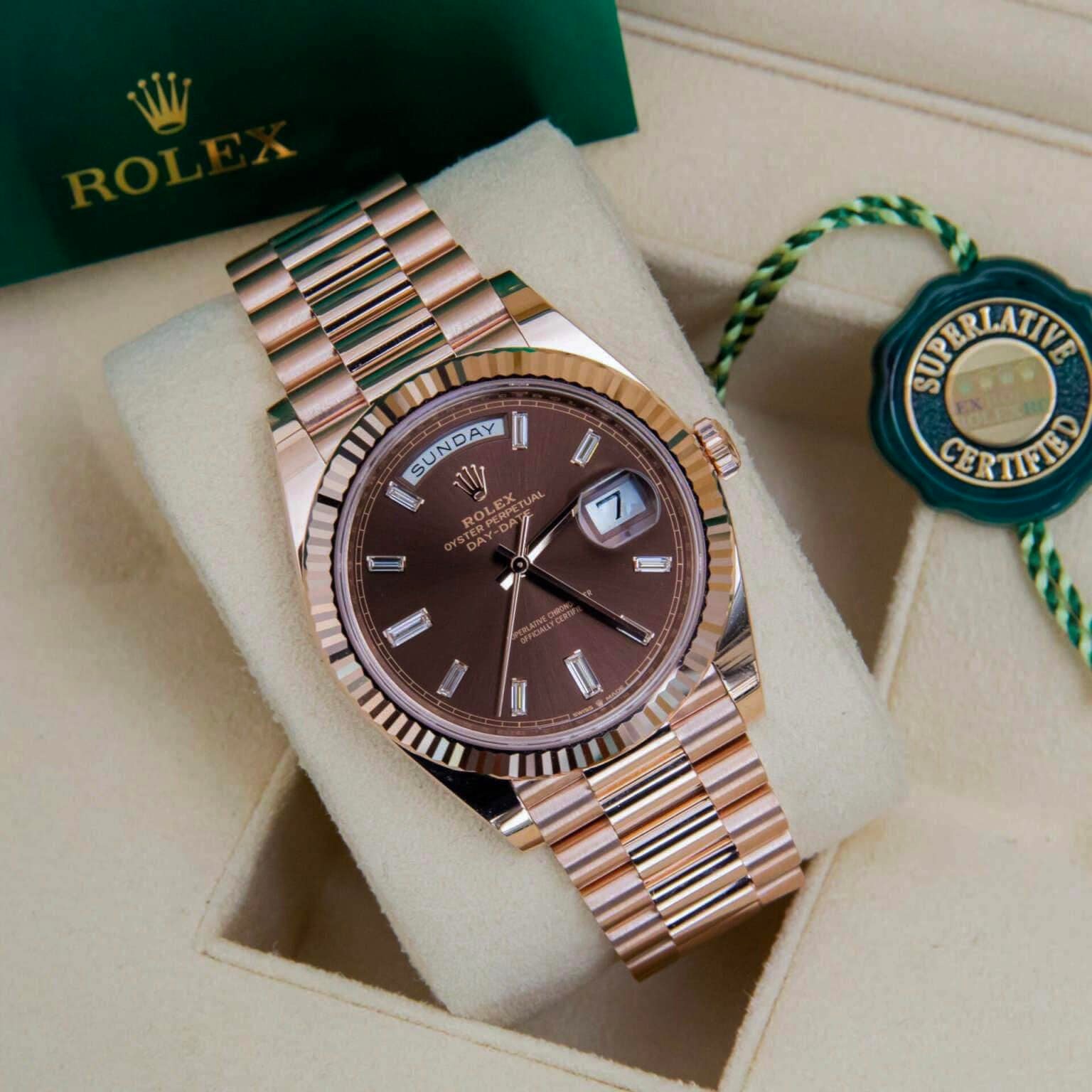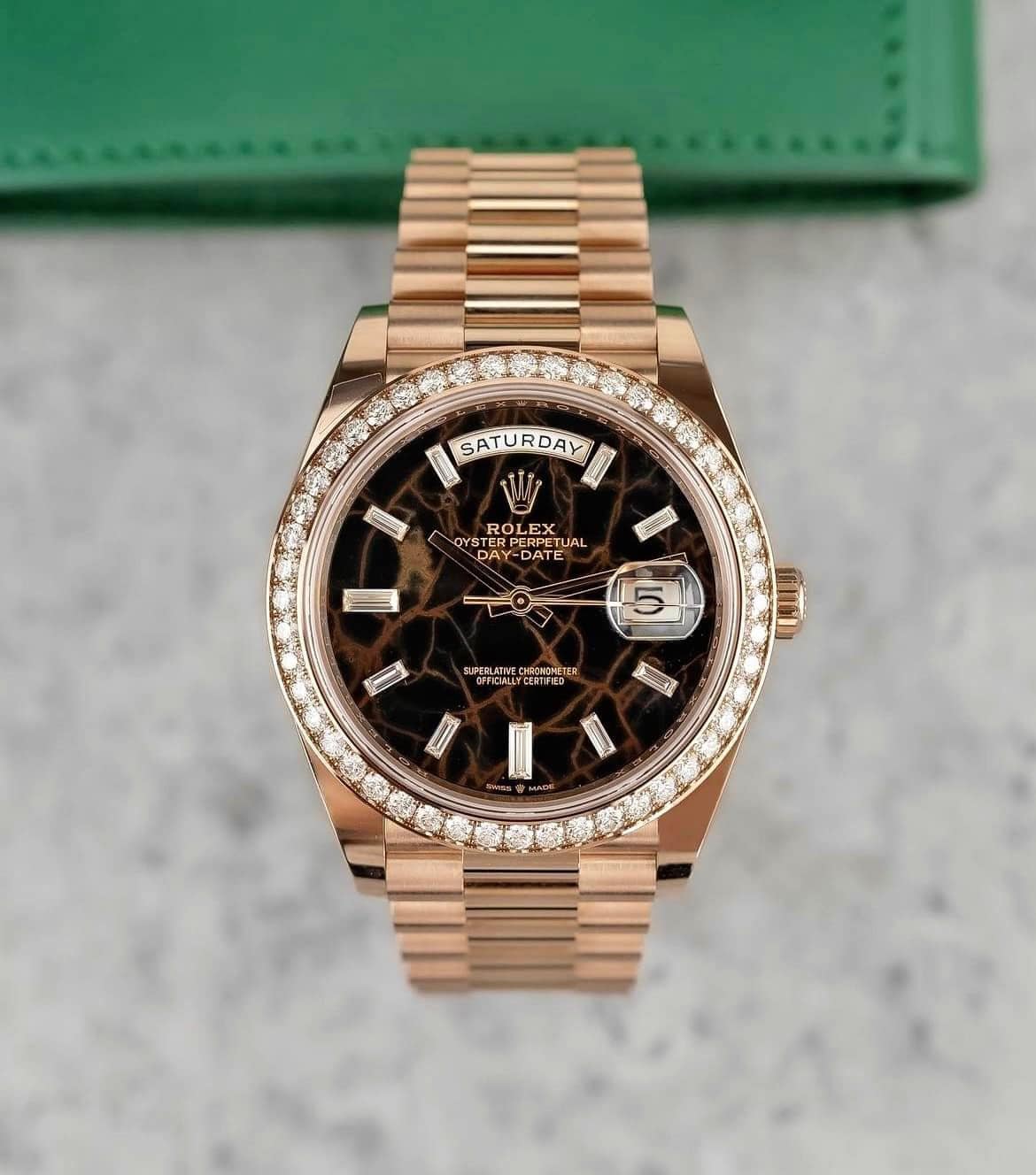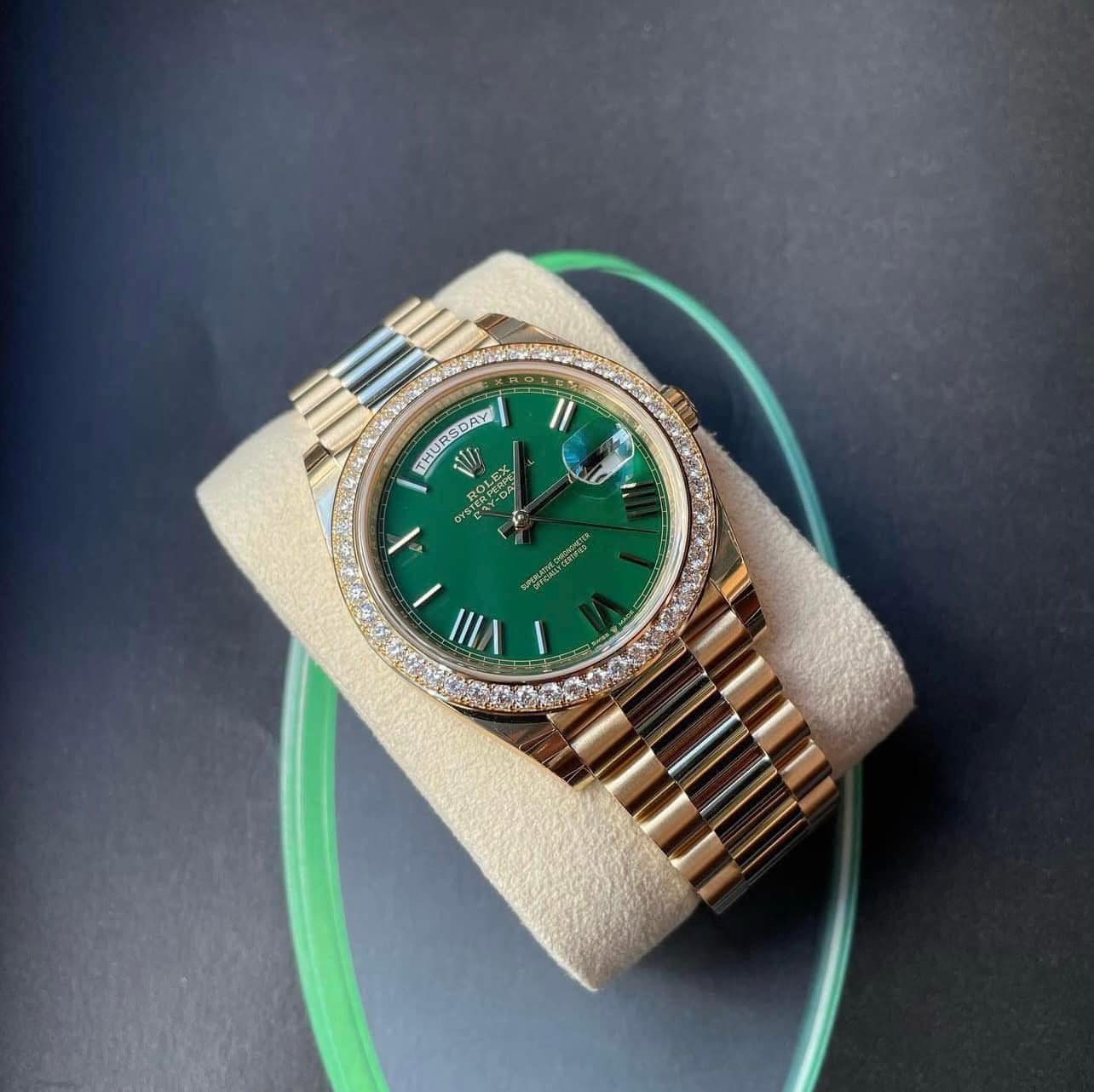 Rolex President 40mm Everose Gold & Green Dial là sự giao thoa hoàn hảo giữa phong cách hiện đại và vẻ đẹp cổ điển. Vỏ vàng Everose 18K quý phái kết hợp cùng mặt số xanh lá cây độc đáo tạo nên một thiết kế vừa lạ mắt, vừa cuốn hút. Dây đeo President đặc trưng càng làm nổi bật vẻ quyền lực và thời thượng của chiếc đồng hồ.