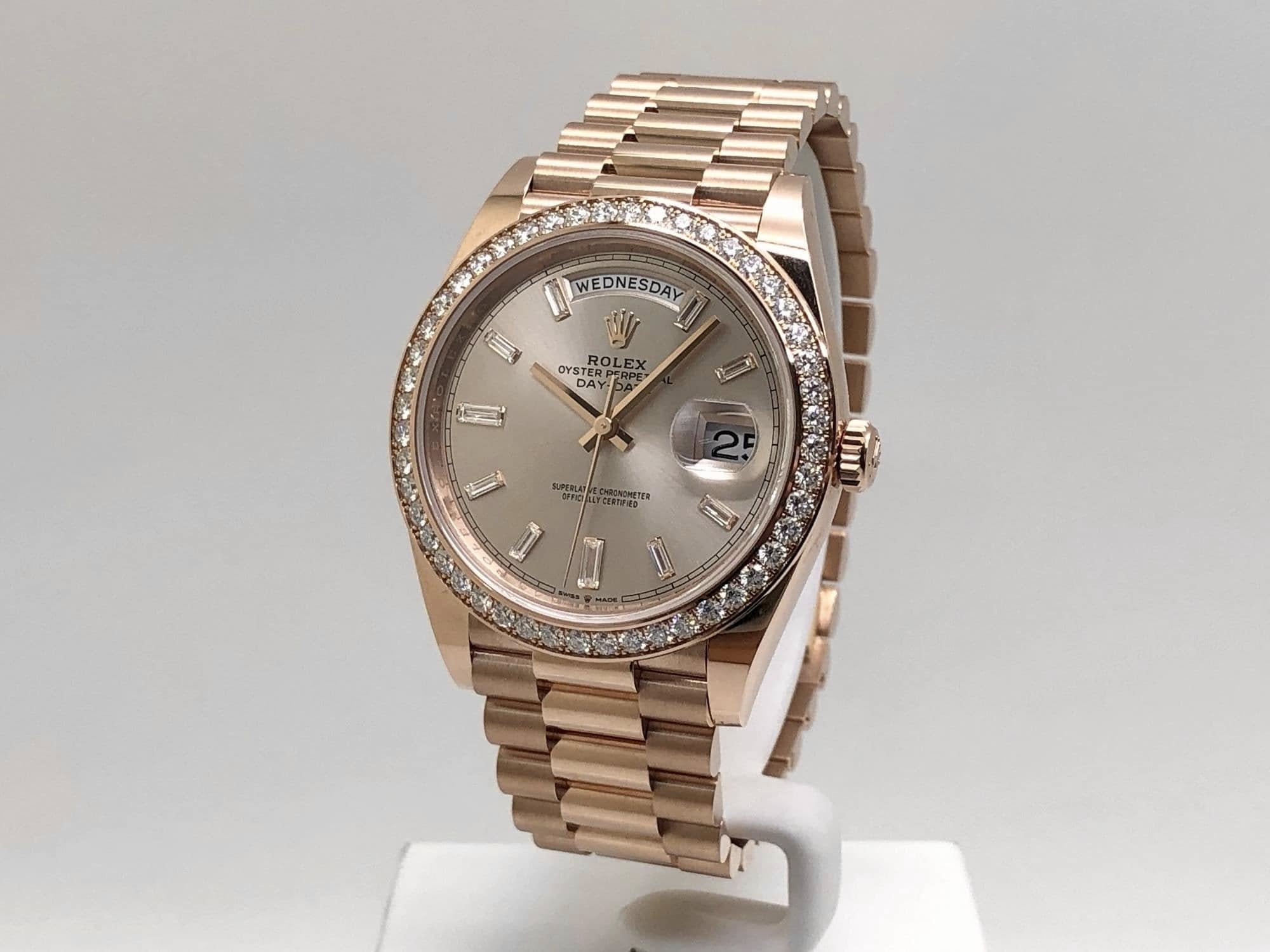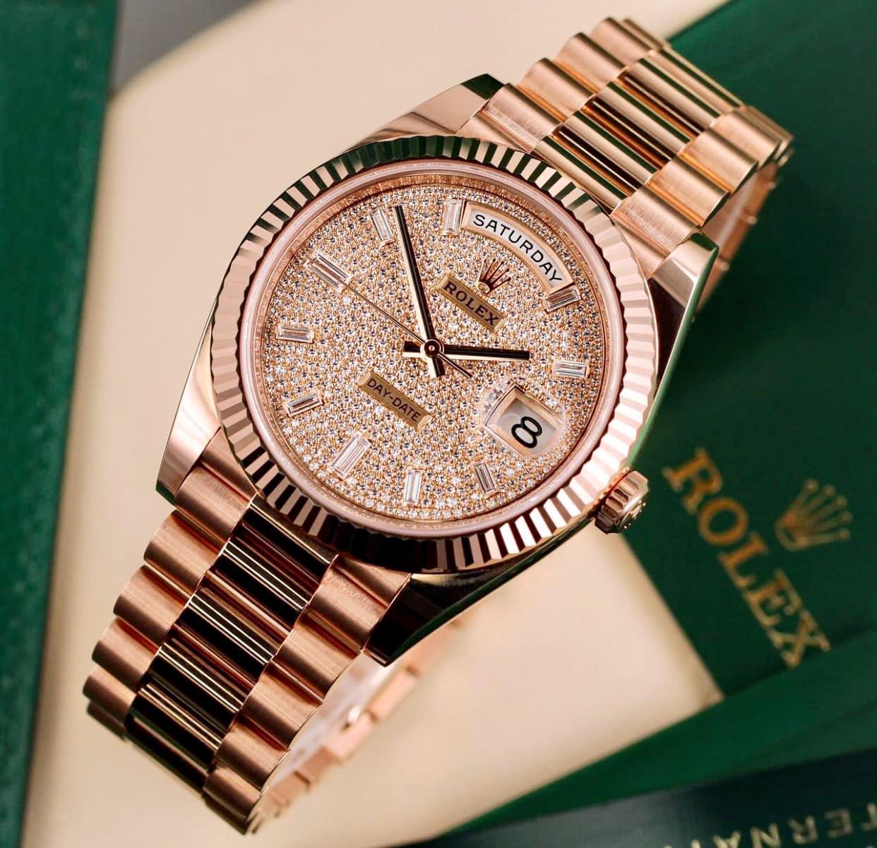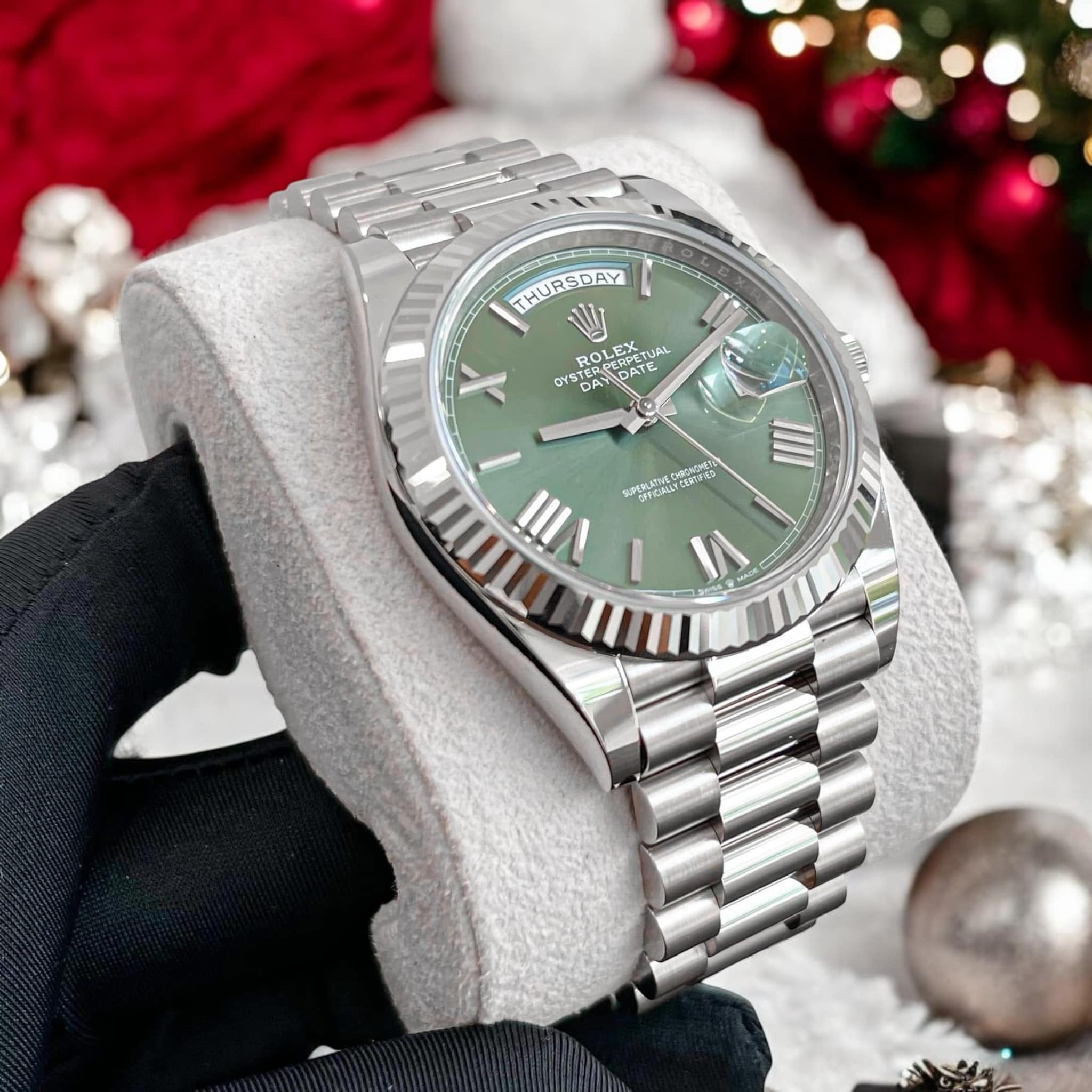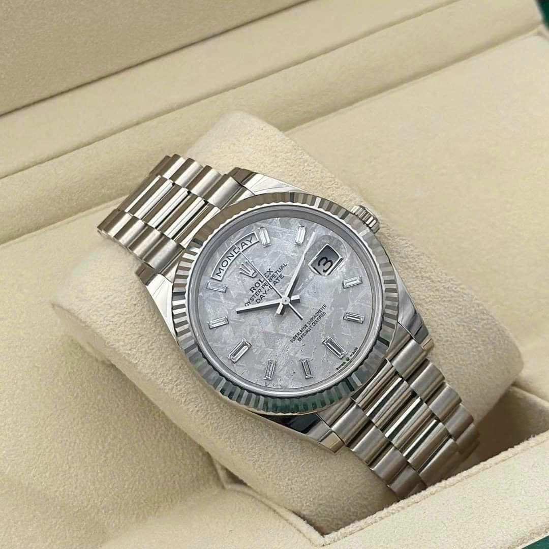 Đặc biệt, các viên kim cương được đặt khéo léo ở vị trí cọc số như một chi tiết nhấn nhá độc đáo. Rolex President 40mm White Gold & Diamonds không chỉ là một món phụ kiện, mà còn là tuyên ngôn về phong cách thanh lịch và gu thẩm mỹ vượt thời gian.
