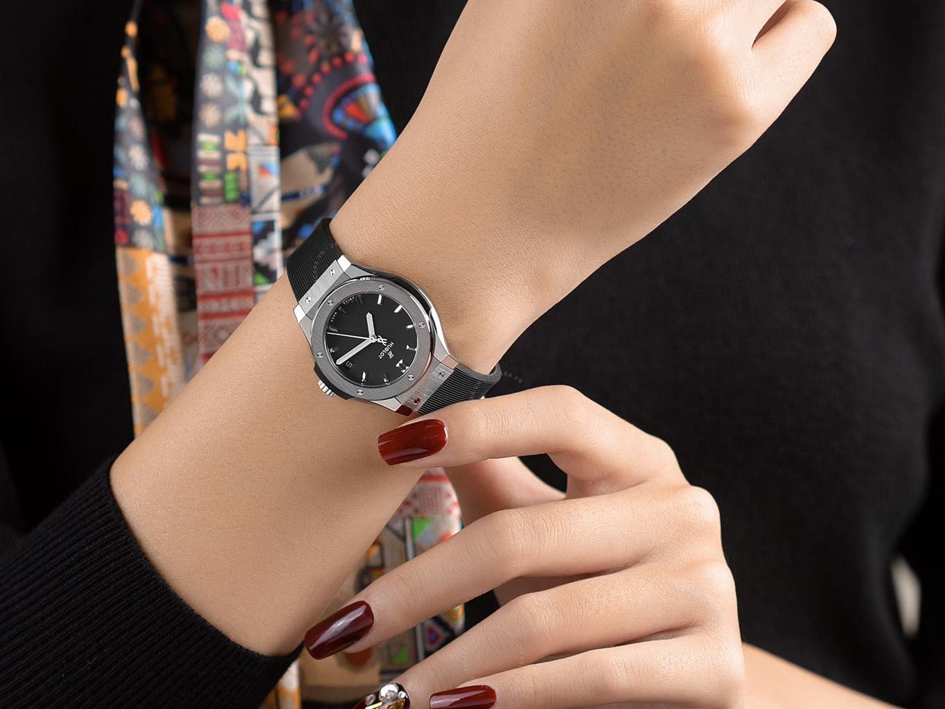 Với kích thước mặt chỉ 33mm, Hublot Classic Fusion Automatic là lựa chọn lý tưởng cho các quý cô. Điều đáng nói là chiếc đồng hồ này lại khoác lên mình tông màu đen - bạc khá huyền bí. Nó khác với những mẫu đồng hồ nữ của các thương hiệu khác trên thị trường - thường có màu trắng, đỏ hoặc hồng. Sự điệu đà của Hublot Classic Fusion Automatic nằm ở phần vành được đính kim cương tự nhiên lấp lánh. Dây đeo cao su mang tới cảm giác mềm mại, trẻ trung thay vì sự quyền lực của dây da cá sấu ở những mẫu đồng hồ dành cho quý ông.