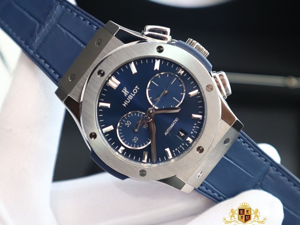 Hublot Classic Fusion Chronograph Titanium Blue cũng cho thấy sự toàn diện về mặt thiết kế. Sản phẩm khoác lên mình màu xanh dương ấn tượng, tạo sự mạnh mẽ, lịch lãm và cuốn hút. Phần dây làm từ da cá sấu dễ dàng điều chỉnh độ rộng - chật. Bộ máy cơ HUB1143 Self-winding Chronograph Movement dự trữ năng lượng tới 42 giờ, mang đến trải nghiệm tuyệt vời.
