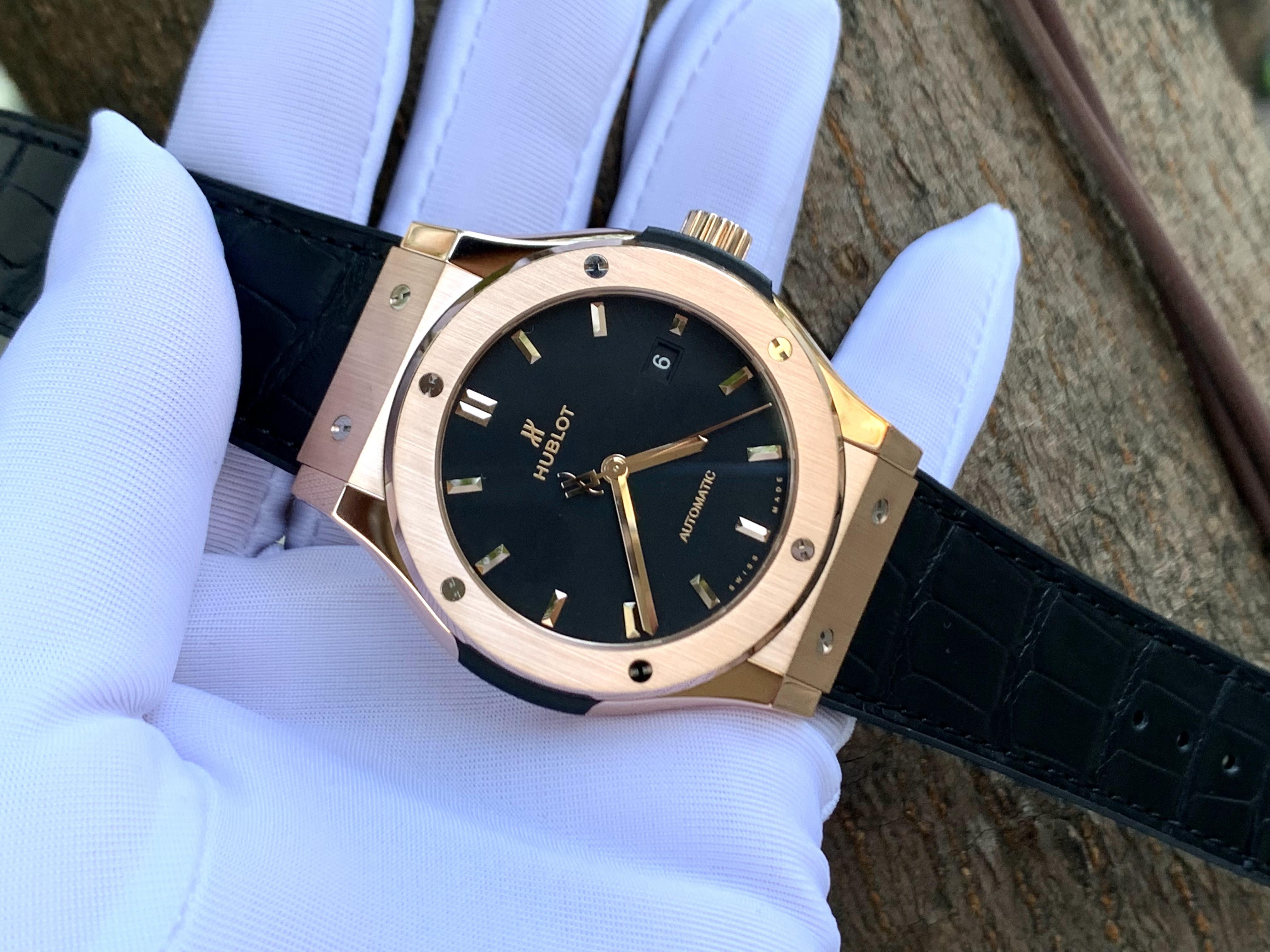 Đây là mẫu đồng hồ được các quý ông thượng lưu rất ưa chuộng. Nó có vẻ ngoài đơn giản nhưng rất sang trọng. Hublot đã cho thấy mắt thẩm mỹ tinh tế của mình khi khéo léo kết hợp ba màu đen - vàng hồng - bạc cho sản phẩm. Mặt số không có quá nhiều chi tiết cầu kỳ, tất cả đều được tối giản một cách tối đa. Bên dưới mốc giờ 12 là cái tên “Hublot” đầy tự mãn, như cái cách mà thương hiệu này đã thống trị thị trường trong suốt nhiều thập kỷ.