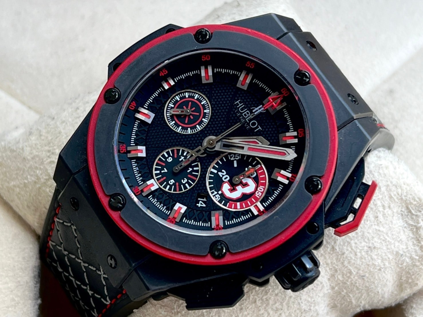 Là sự kết hợp hoàn hảo giữa tông màu đen và đỏ, sản phẩm Hublot King Power Dwayne Wade 703.CI.1123.VR.DWD11 khiến ai cũng phải trầm trồ.