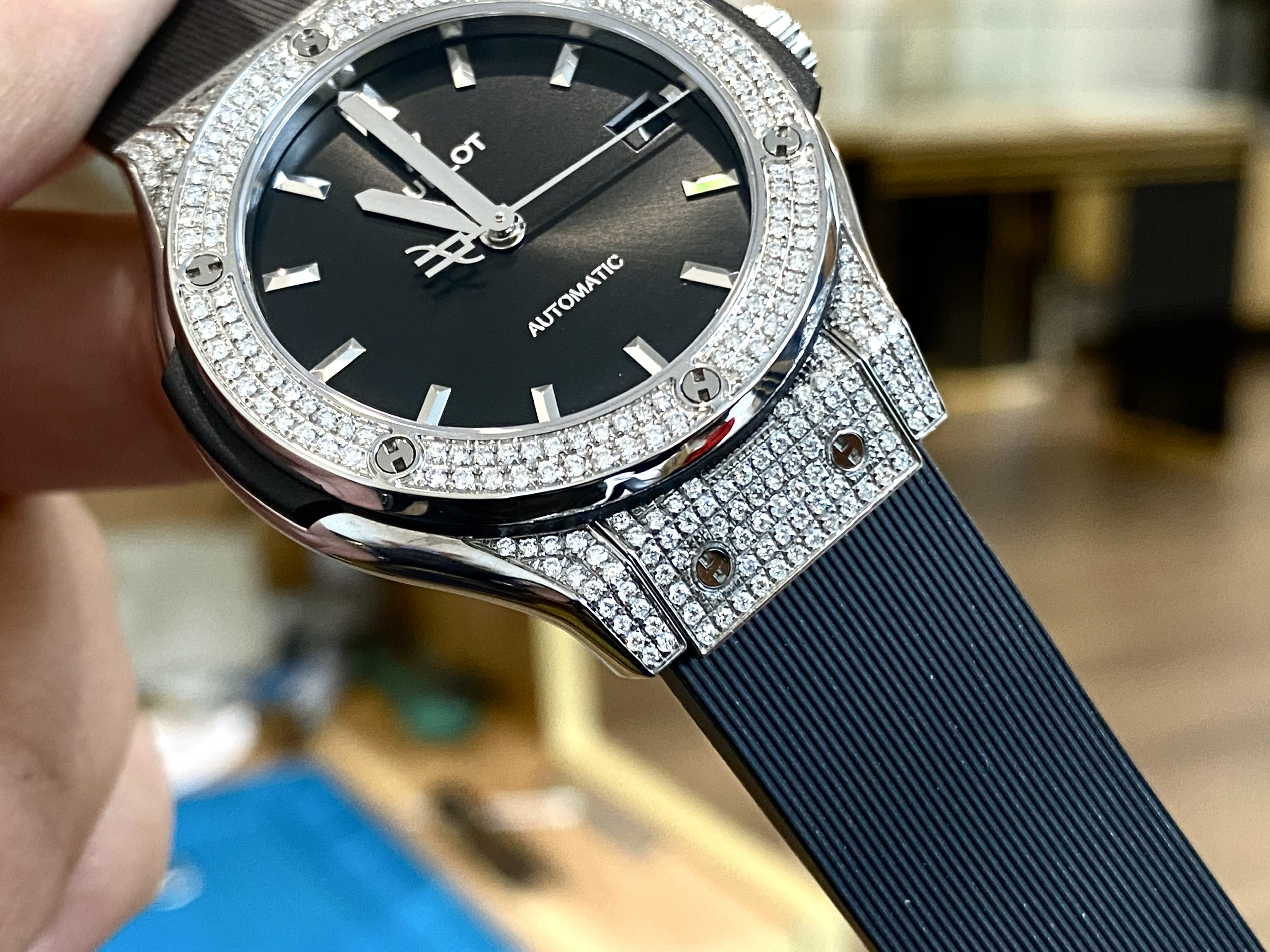 Nằm trong bộ sưu tập Classic Fusion với tone màu đen làm chủ đạo, những chiếc đồng hồ Hublot này không vì thế mà bị kém sang hay không thu hút. Bởi ngoài dây đeo được làm từ da cá sấu và những chi tiết sắc sảo khác thì phần viền bezel được đính các viên kim cương lấp lánh càng được nổi bật hơn bội phần.